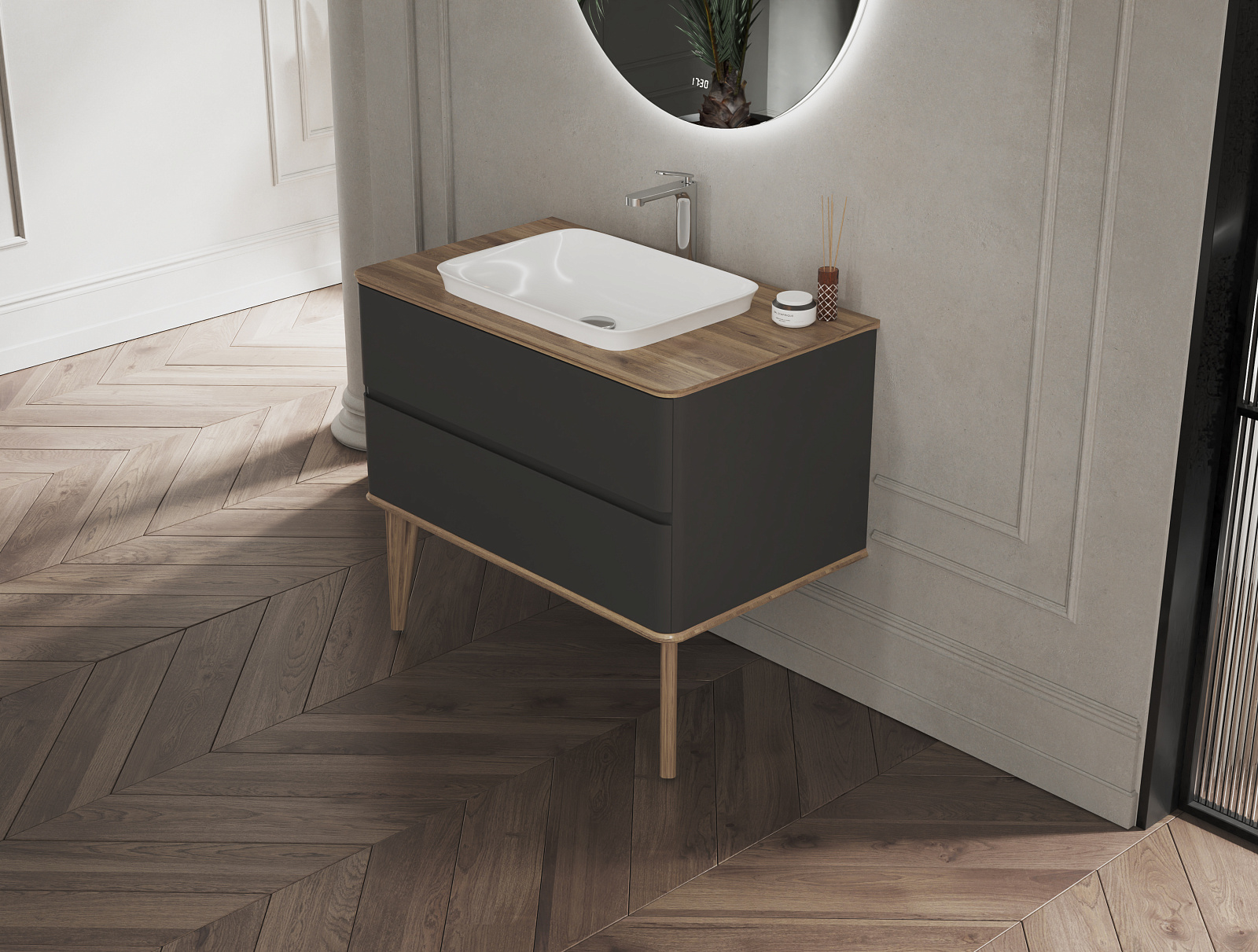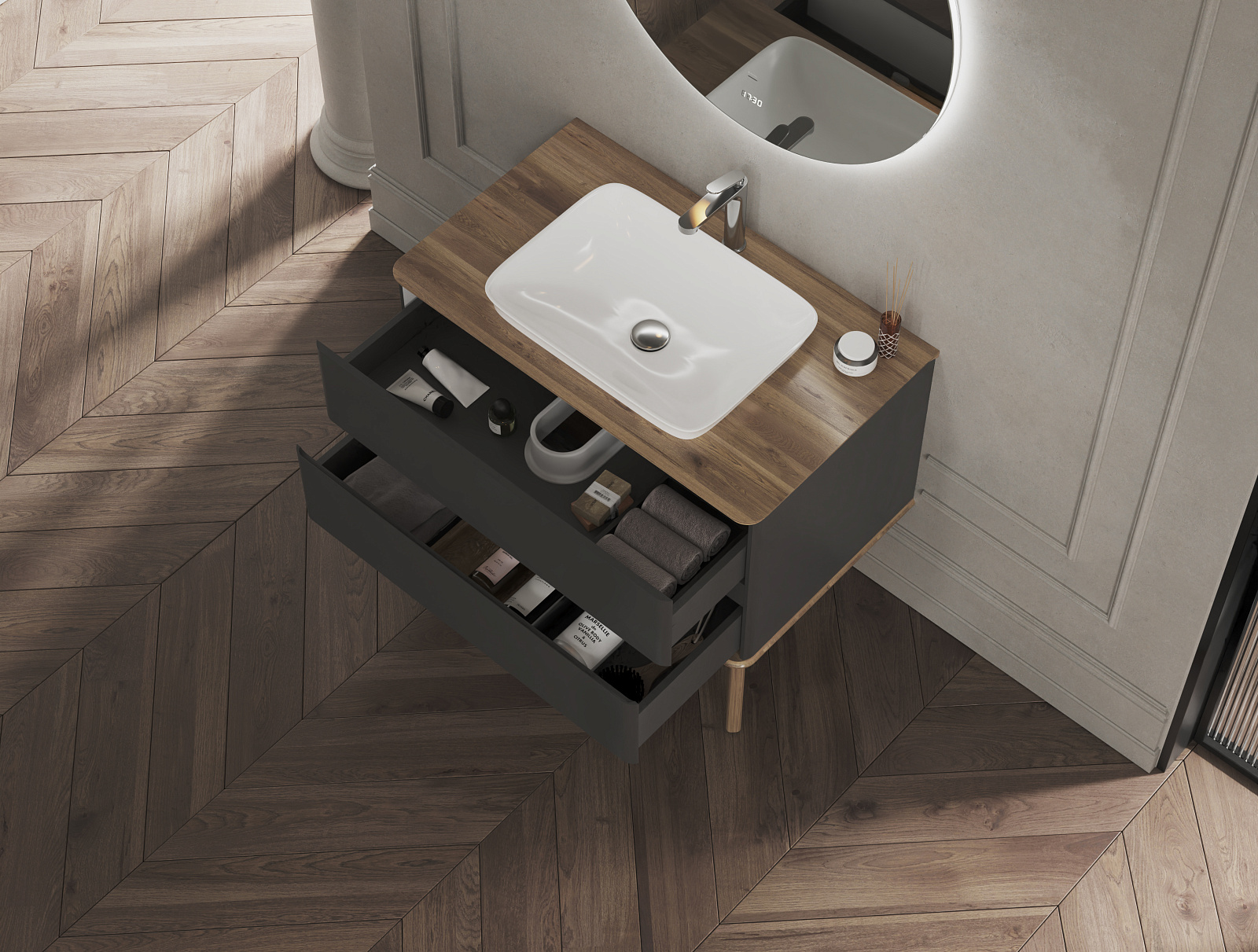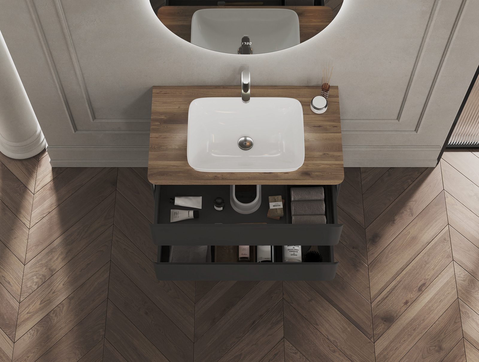 Тумба выполнена из влагостойких материалов, покрытых матовой пленкой цвета антрацит. Этот глубокий, почти загадочный оттенок придаёт мебели выразительность и современный стиль, подчеркивая элегантность пространству тумбы 2 вместительных выдвижных ящика, оснащенных надёжной фурнитурой, которая обеспечивает долговечность и простоту эксплуатации. Столешница также выполнена из влагостойкого материала максимально повторяющего цвет и фактуру дерева.