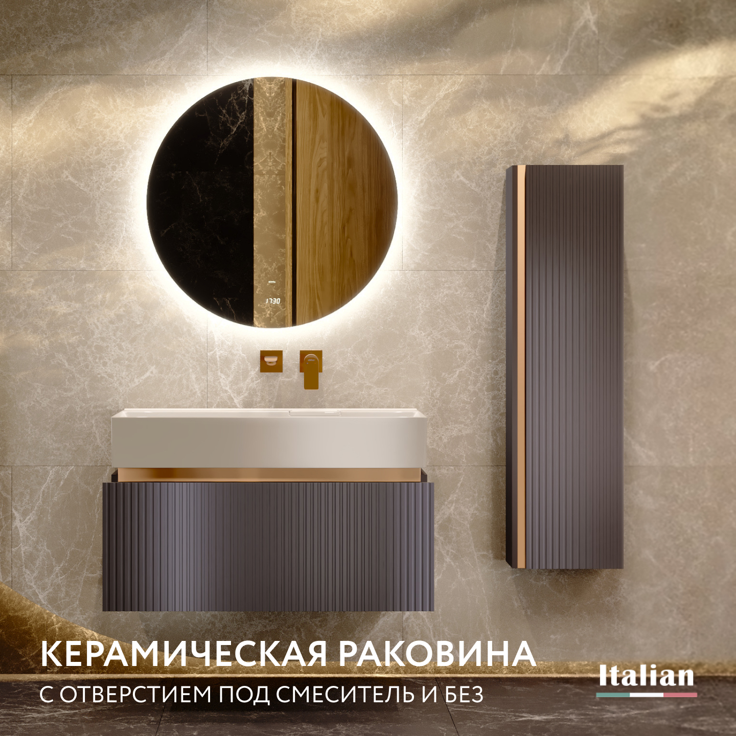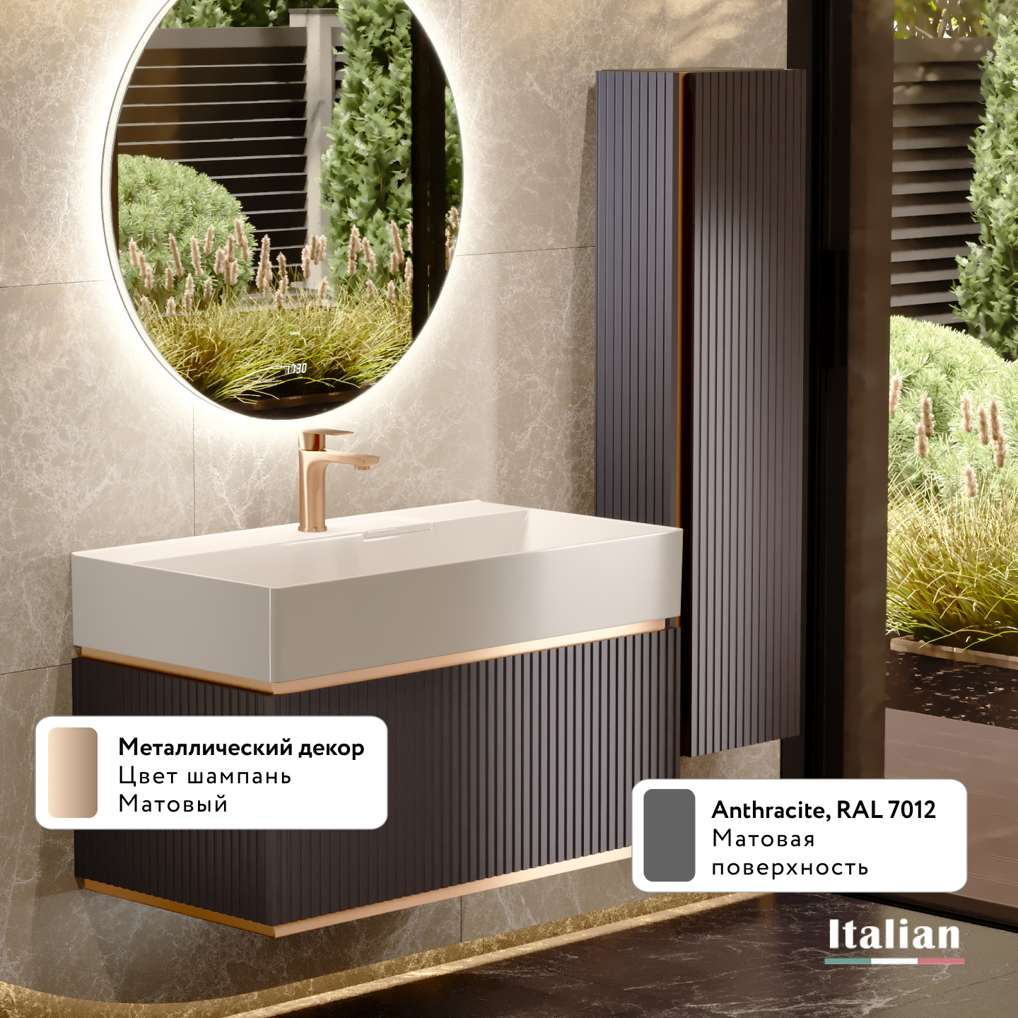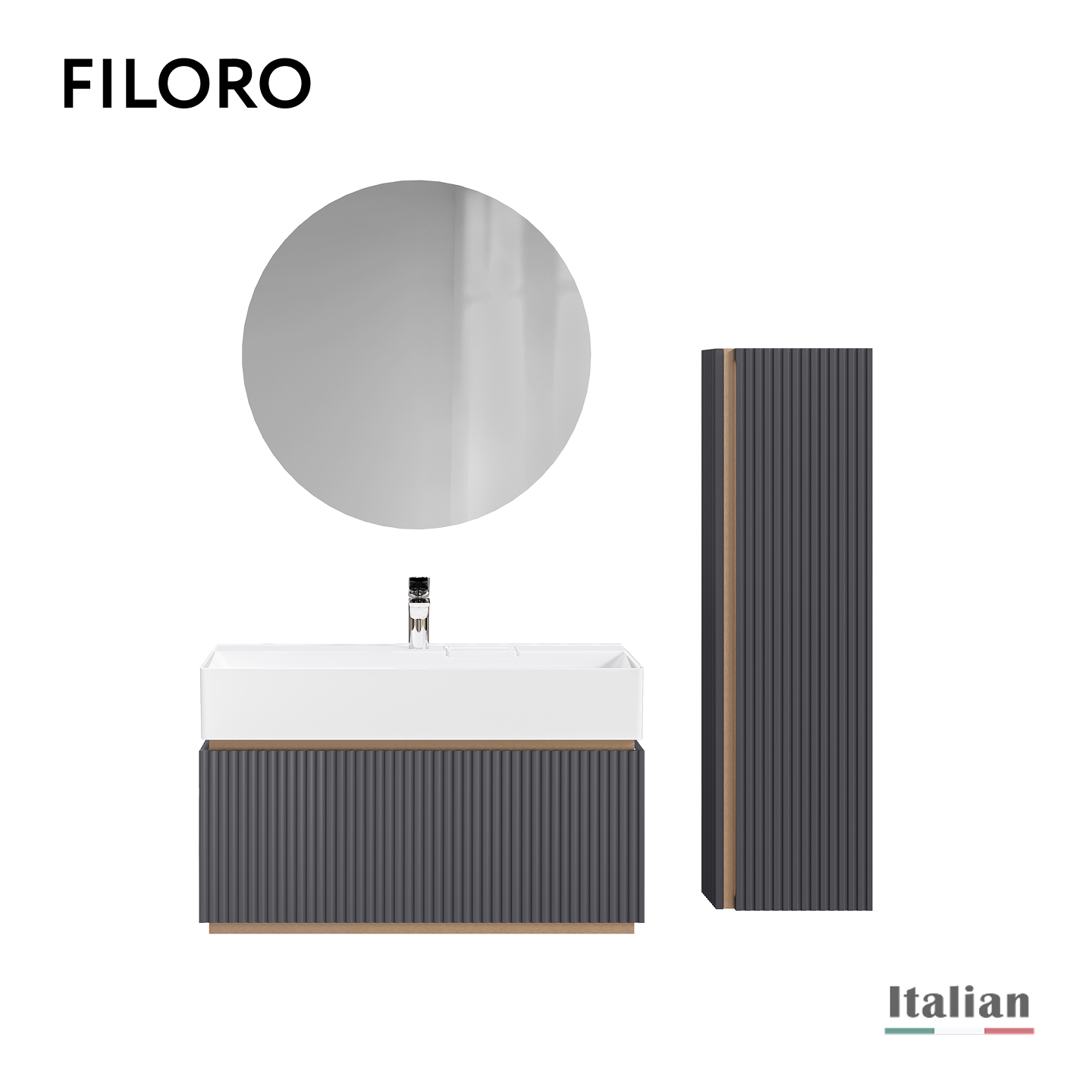 Коллекция Filoro — "золотая нить" итальянского дизайна в вашей ванной. Её название, от итал. "filo de oro", идеально отражает суть: стильные металлические вставки благородного золотого оттенка подчёркивают изысканность форм. Фрезерованные корпуса и фасады из МДФ в классических цветах — белый и антрацит, создают тактильное удовольствие.