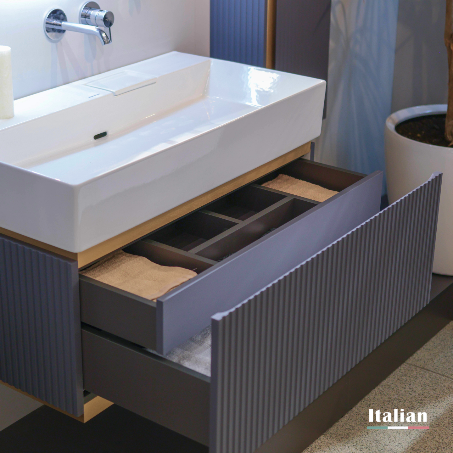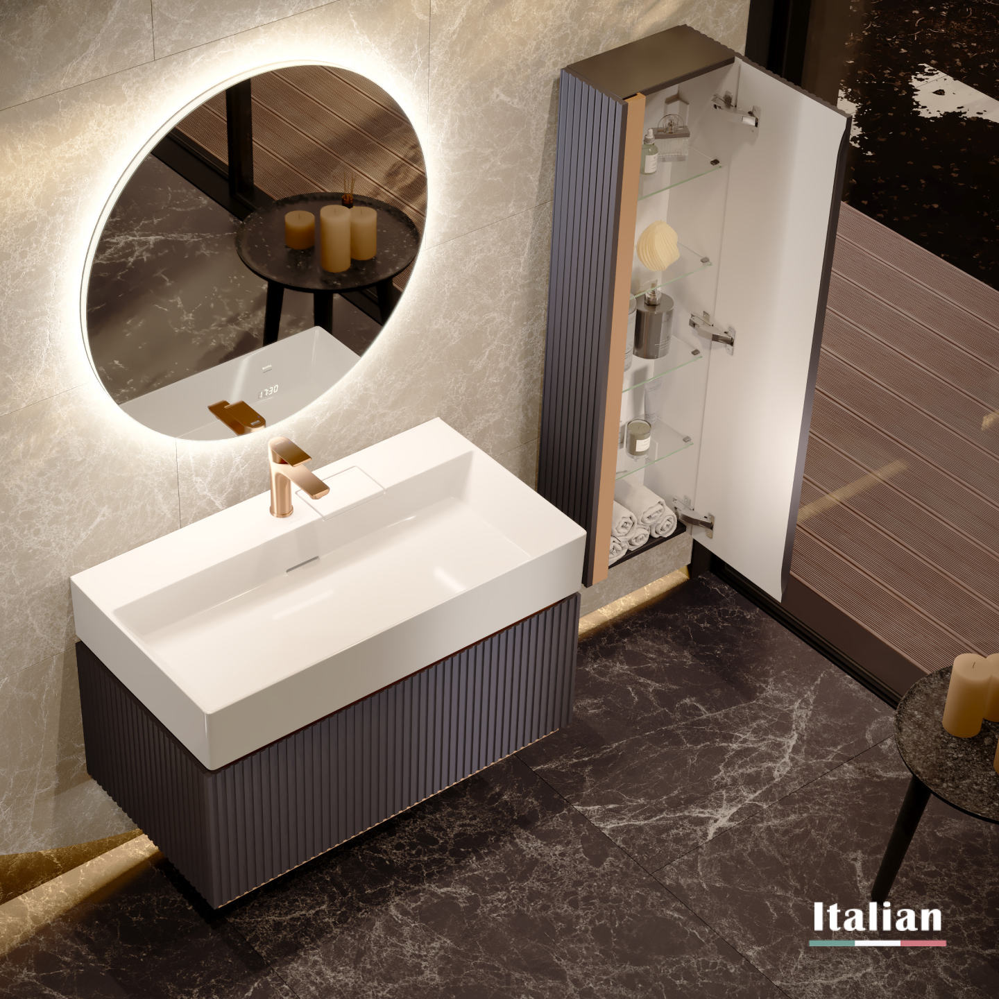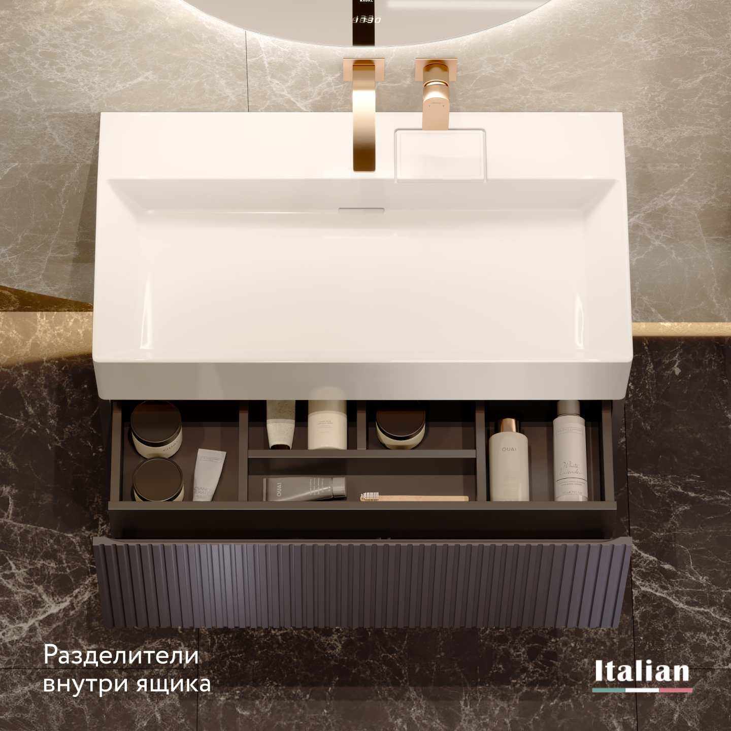 Коллекция Filoro — "золотая нить" итальянского дизайна в вашей ванной. Её название, от итал. "filo de oro", идеально отражает суть: стильные металлические вставки благородного золотого оттенка подчёркивают изысканность форм. Фрезерованные корпуса и фасады из МДФ в классических цветах — белый и антрацит, создают тактильное удовольствие.