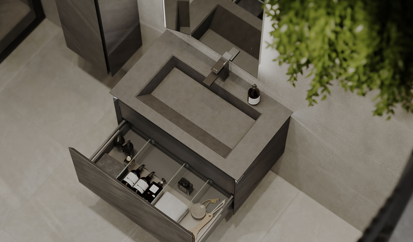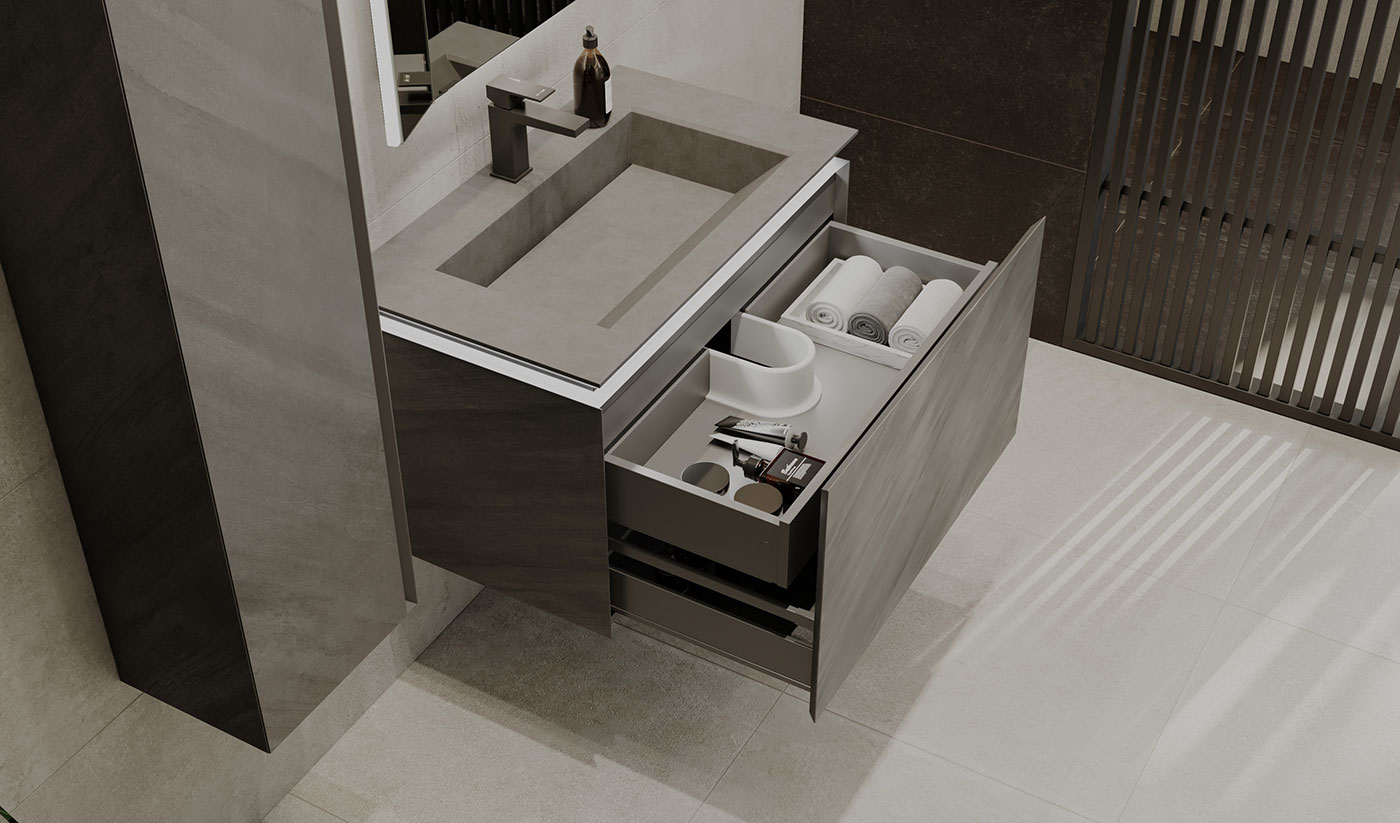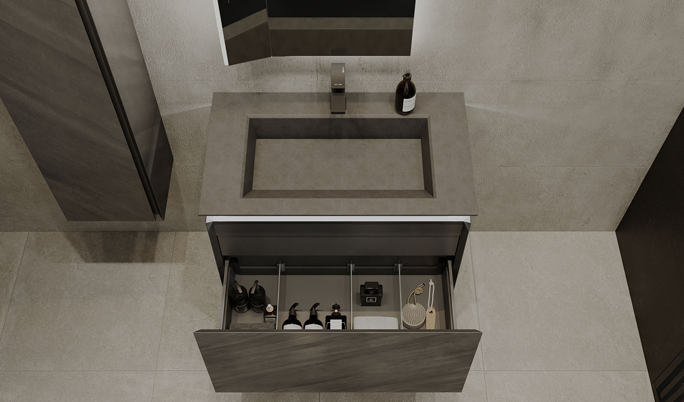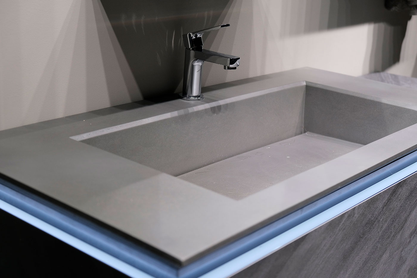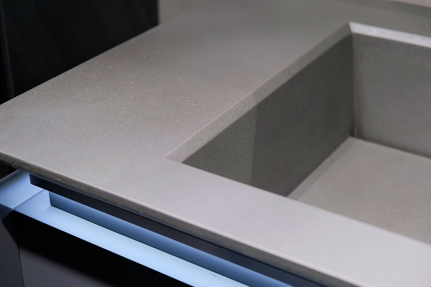 Раковина изготовлена по собственному дизайну из высокопрочного архитектурного бетона. Контраст между тяжестью бетона и легкостью света под ним придает особую эмоциональность. Корпус и фасад тумбы и пенала выполнены из МДФ, покрытым пластиком HPL цвета «бетон». Вместительный ящик тумбы оснащен системой Metabox и стеклянным разделителем внутри. HPL – современный, очень прочный материал, стойкий к химическим и механическим повреждениям, воздействию влаги (не коробится) и света (не выцветает), прост в уходе, устойчив к истиранию. Ящики с системой MetaBox с системой плавного закрывания. Внутренний дополнительный ящик для мелочей. Стеклянные разделители в ящиках с возможностью перестановки
