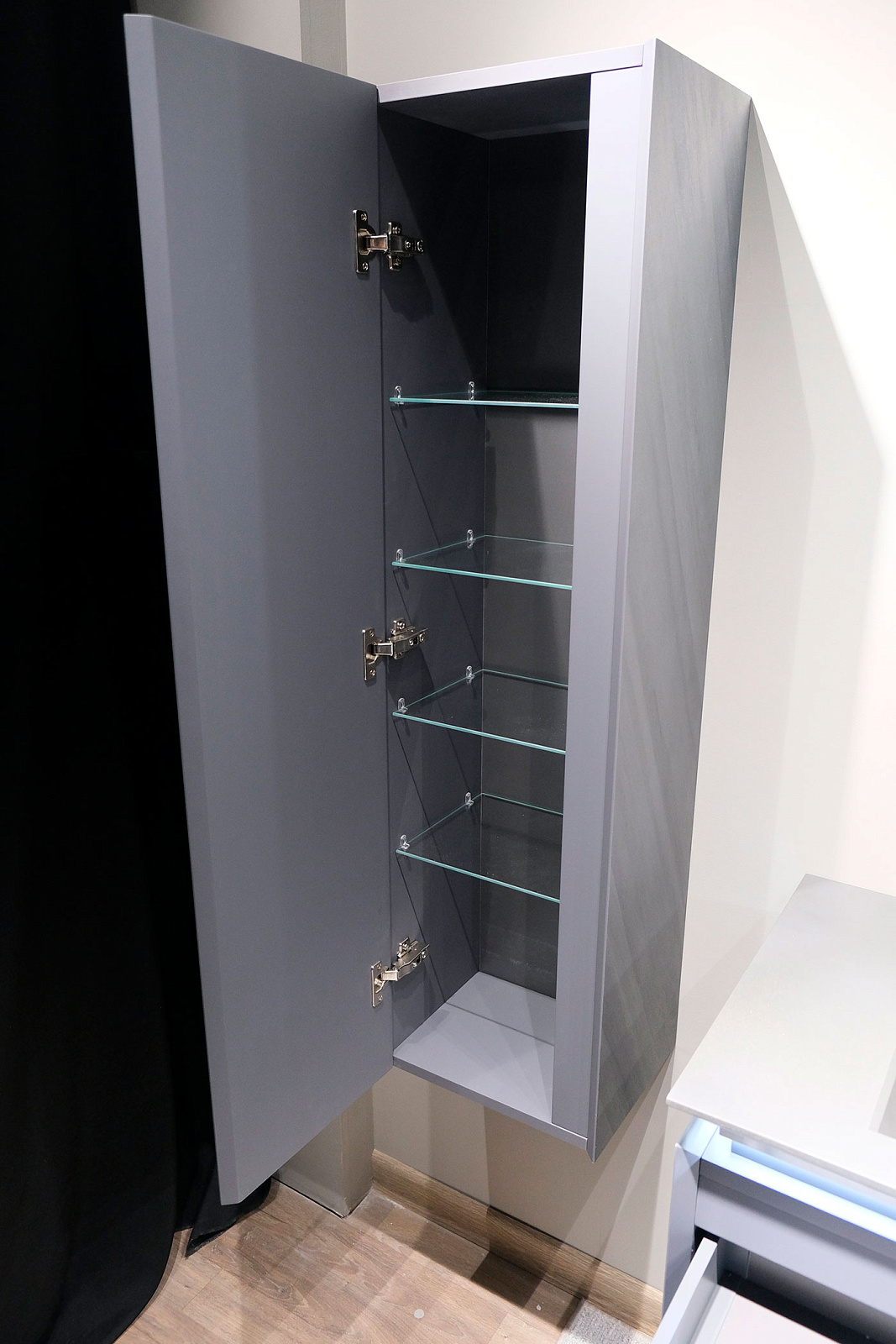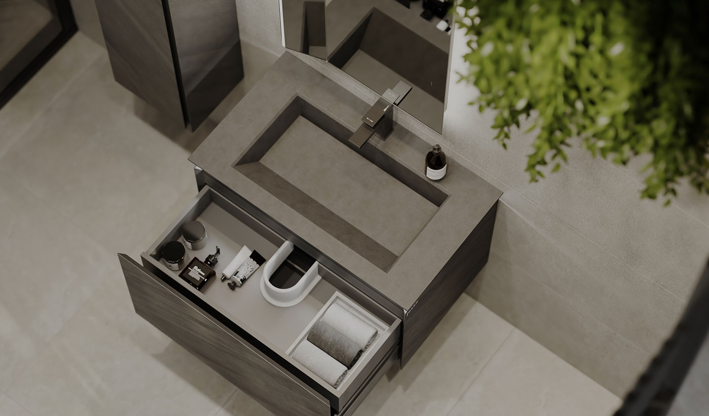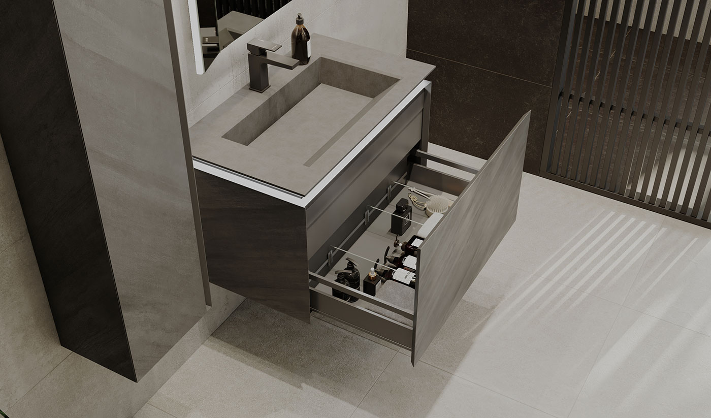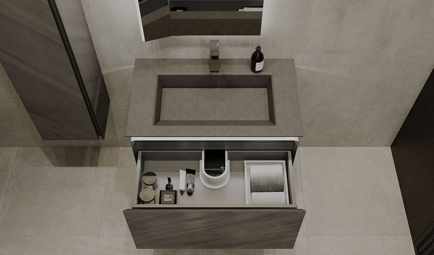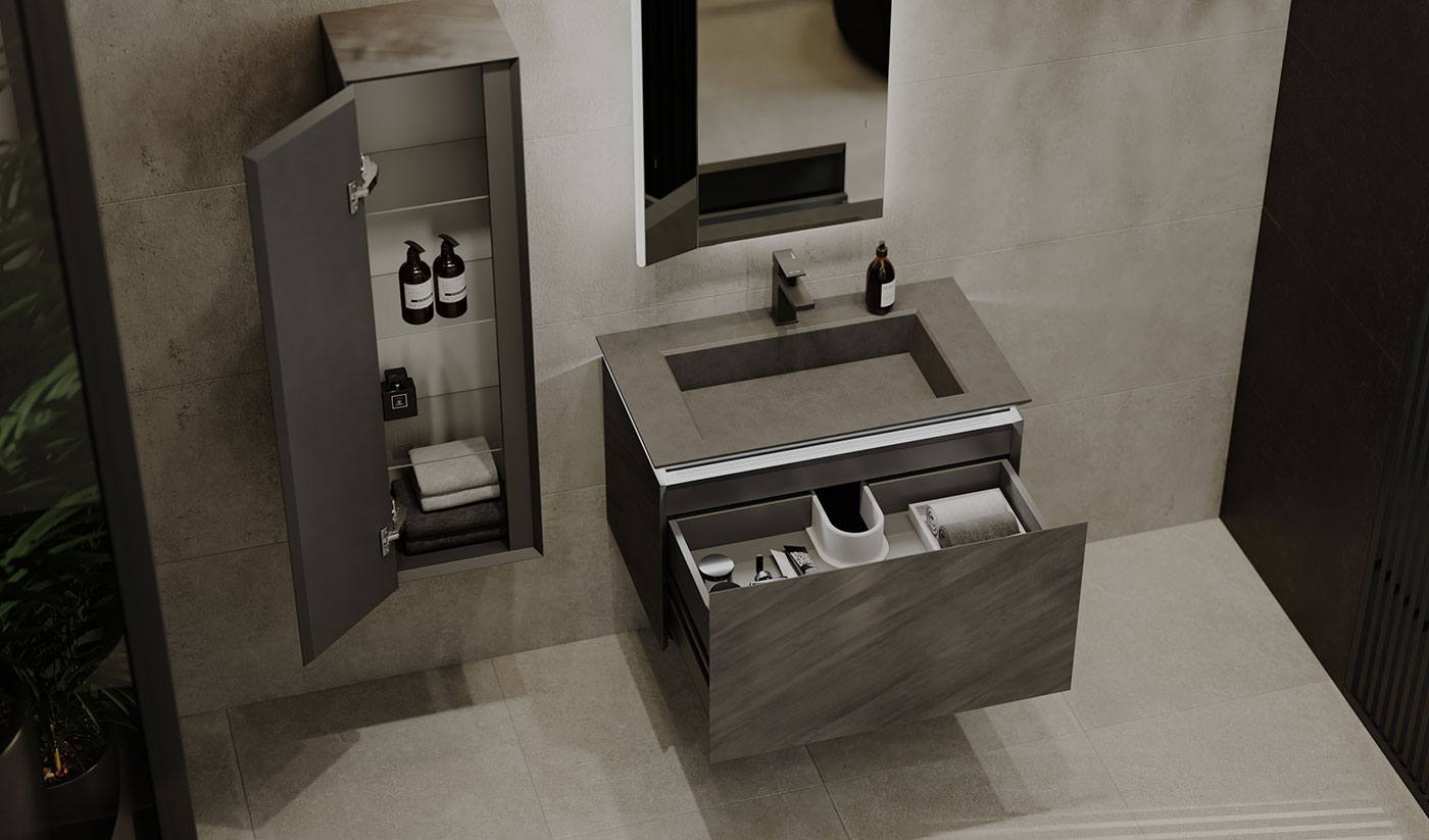 Раковина изготовлена по собственному дизайну из высокопрочного архитектурного бетона. Контраст между тяжестью бетона и легкостью света под ним придает особую эмоциональность. Корпус и фасад тумбы и пенала выполнены из МДФ, покрытым пластиком HPL цвета «бетон». Вместительный ящик тумбы оснащен системой Metabox и стеклянным разделителем внутри. HPL – современный, очень прочный материал, стойкий к химическим и механическим повреждениям, воздействию влаги (не коробится) и света (не выцветает), прост в уходе, устойчив к истиранию. Ящики с системой MetaBox с системой плавного закрывания. Внутренний дополнительный ящик для мелочей. Стеклянные разделители в ящиках с возможностью перестановки