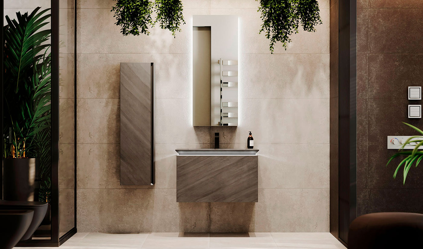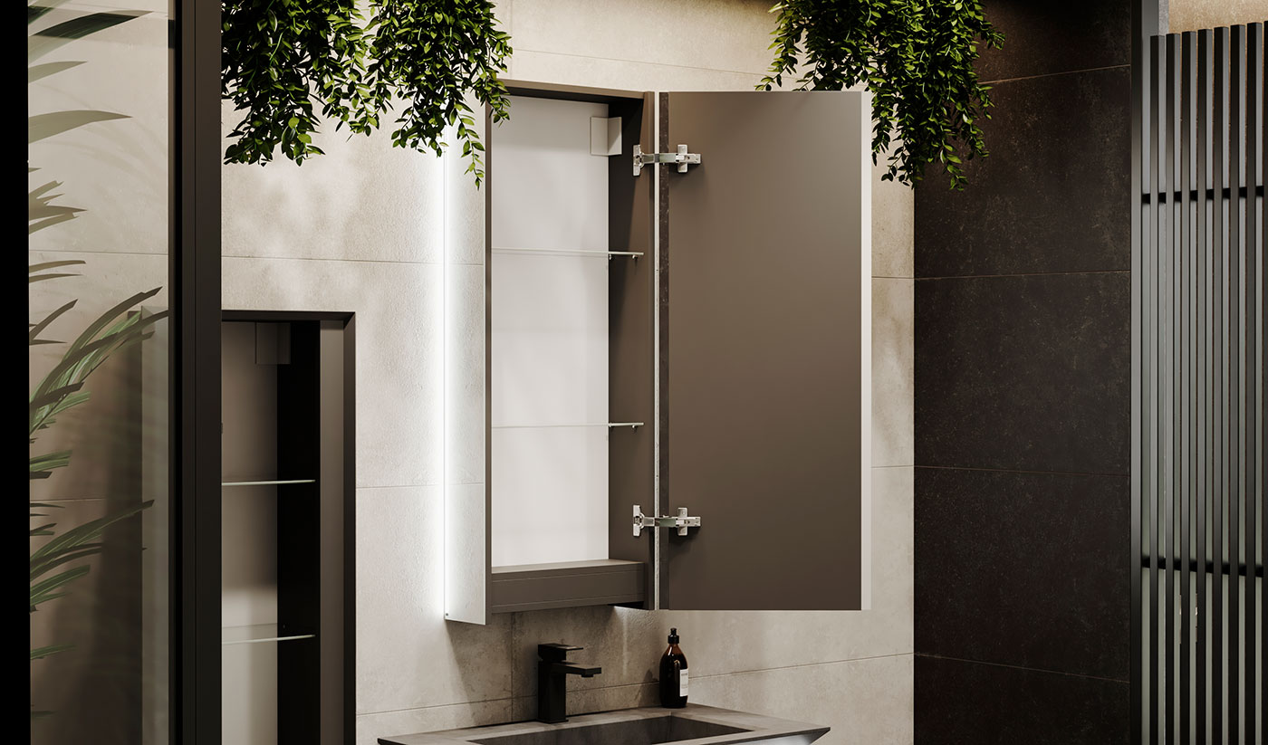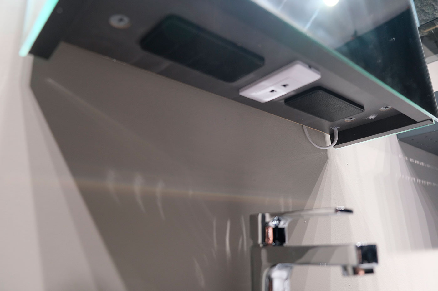 Возможна комплектация 2 видами зеркал: зеркальное полотно и зеркало-шкаф, со встроенными колонками и Bluetooth- системой.