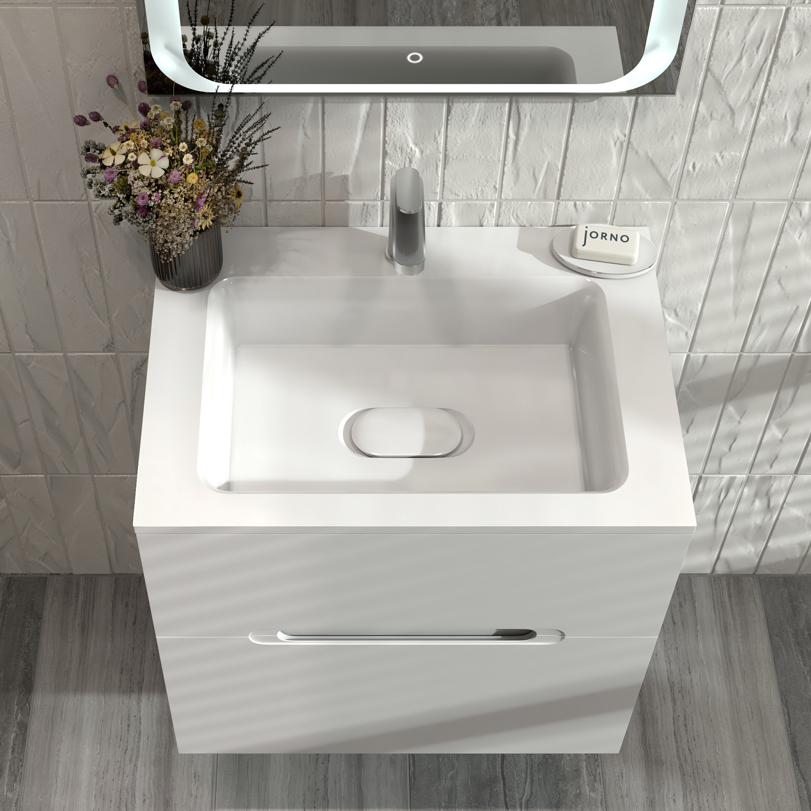Четкие прямые линии краев тумбы и раковины образуют форму лаконичного куба, в котором будто вырезаны ручка и раковина с округлыми краями. Отсутствие лицевой фурнитуры создает чистый образ и решает функцию открывания максимально эффективно.
