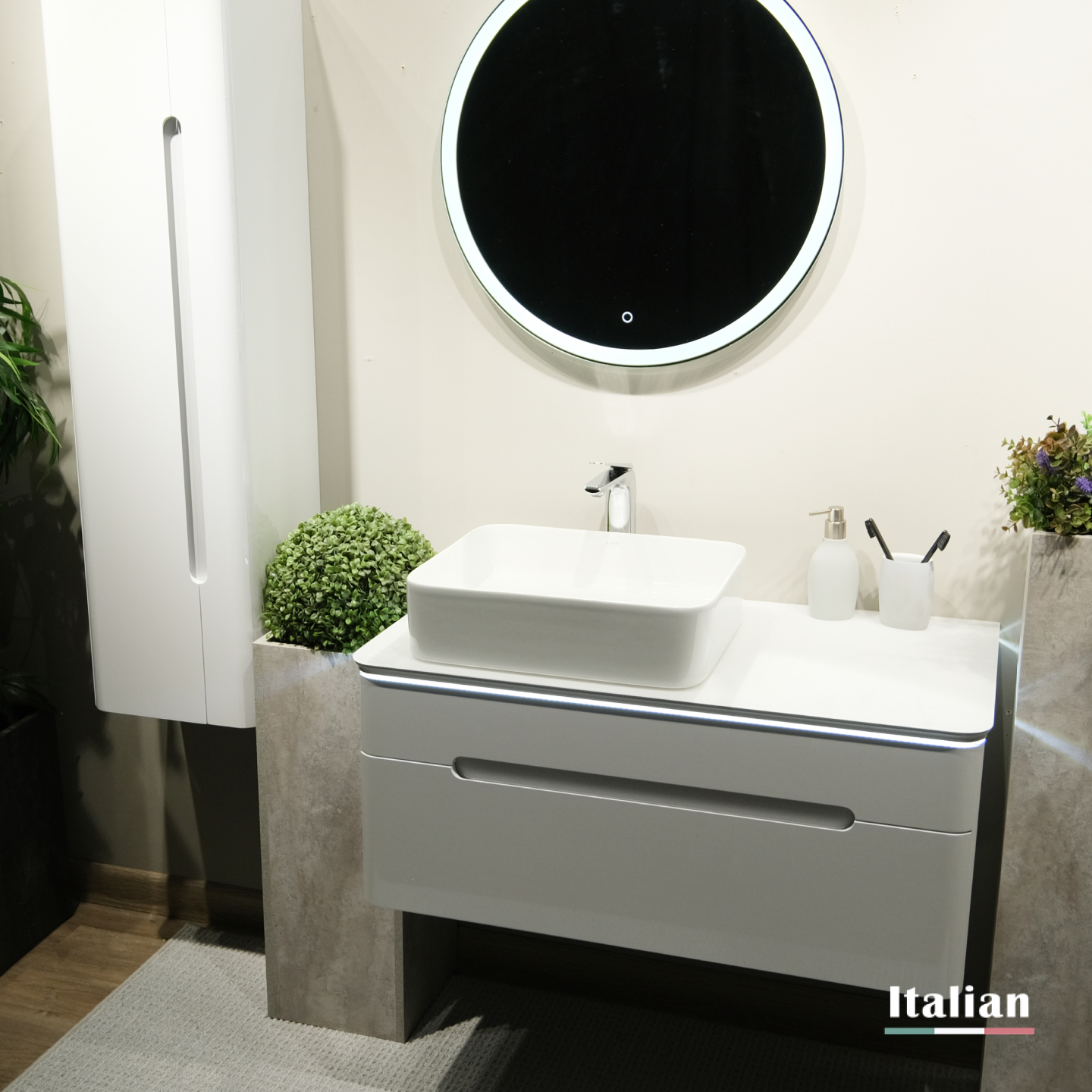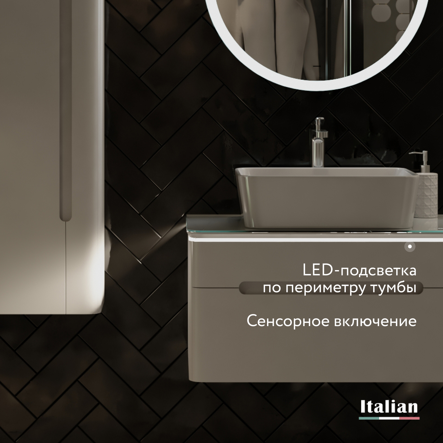 Тумба оснащена подсветкой столешницы и...сенсорным включателем.