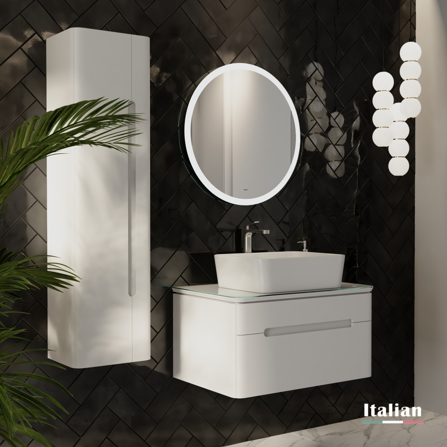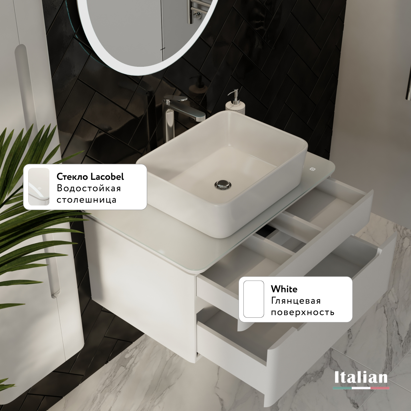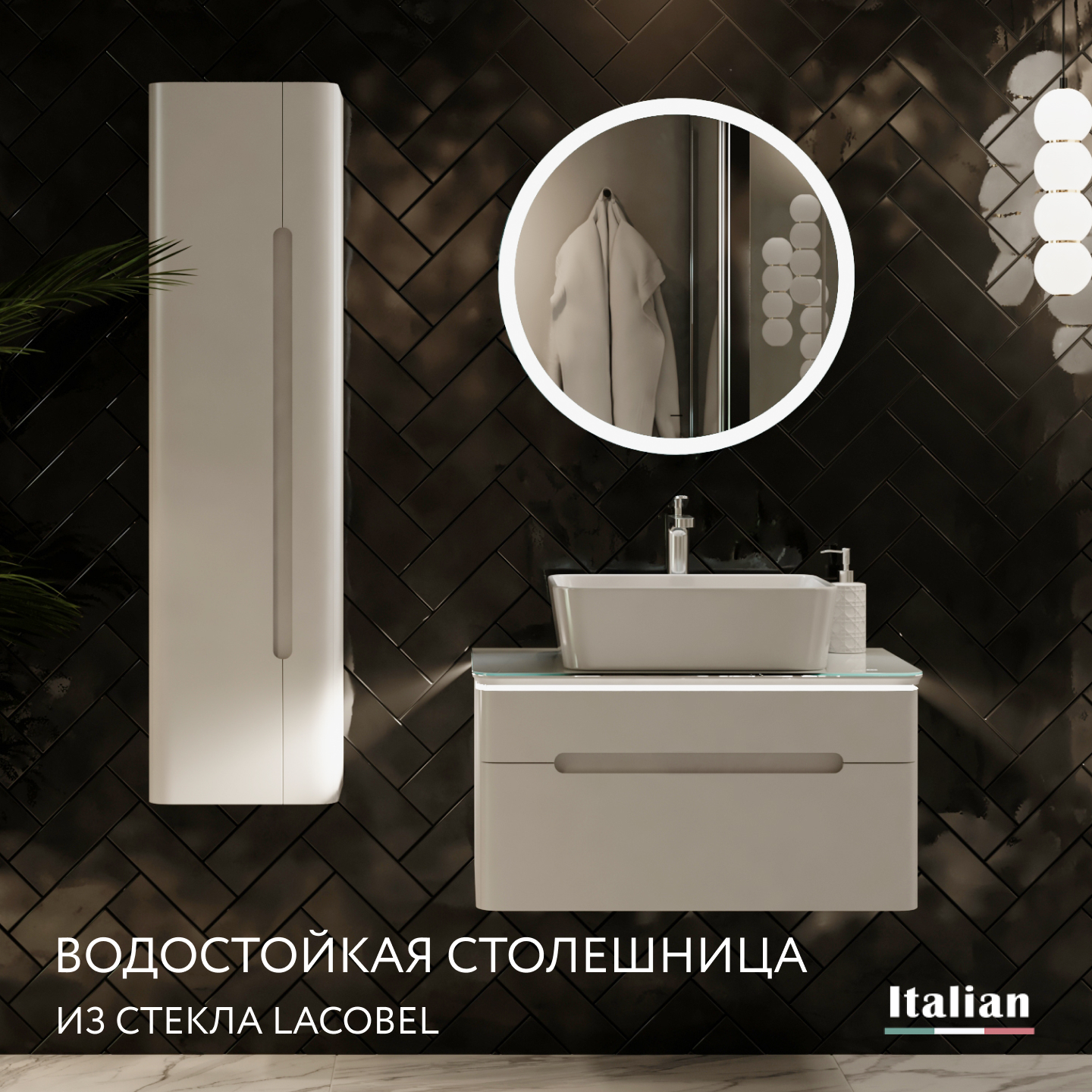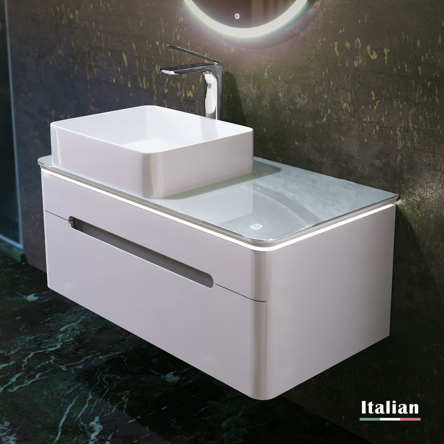 Нижний свет тумбы создает ощущение плавности в пространстве интерьера. Зеркало со светодиодной подсветкой в сочетании со столешницей из стекла Lacobel придает легкость композиции.