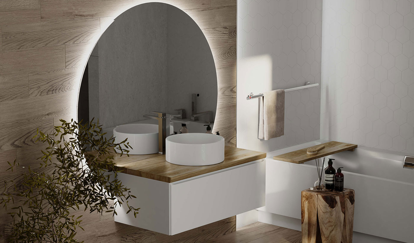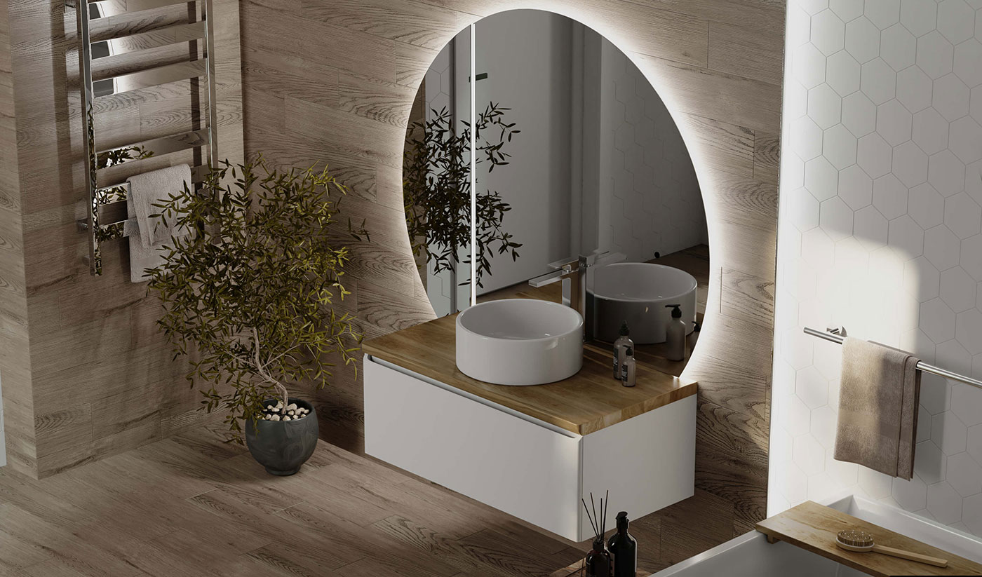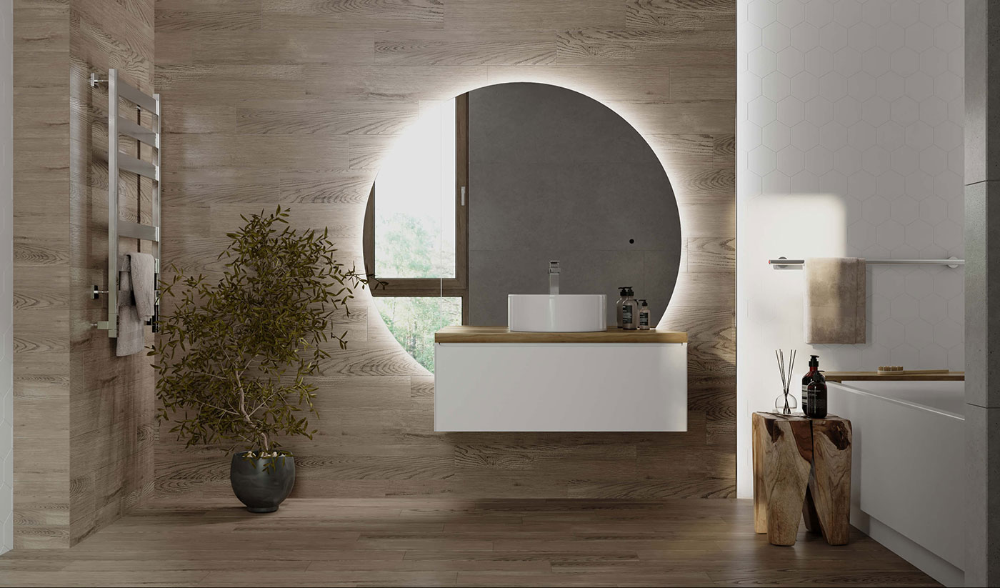 Большое круглое зеркало с подсветкой по периметру, напоминающее солнечный диск, увеличивает пространство ванной комнаты, смягчает его и придает гармонию интерьеру ванной комнаты. Светодиодная подсветка зеркала оснащена бесконтактным включателем. Пенал, встроенный в зеркало, имеет дополнительную вертикальную подсветку и розетку. Вариативность комплектации зеркала позволяет адаптировать коллекцию по ширине, функционалу и визуальному богатству образа.