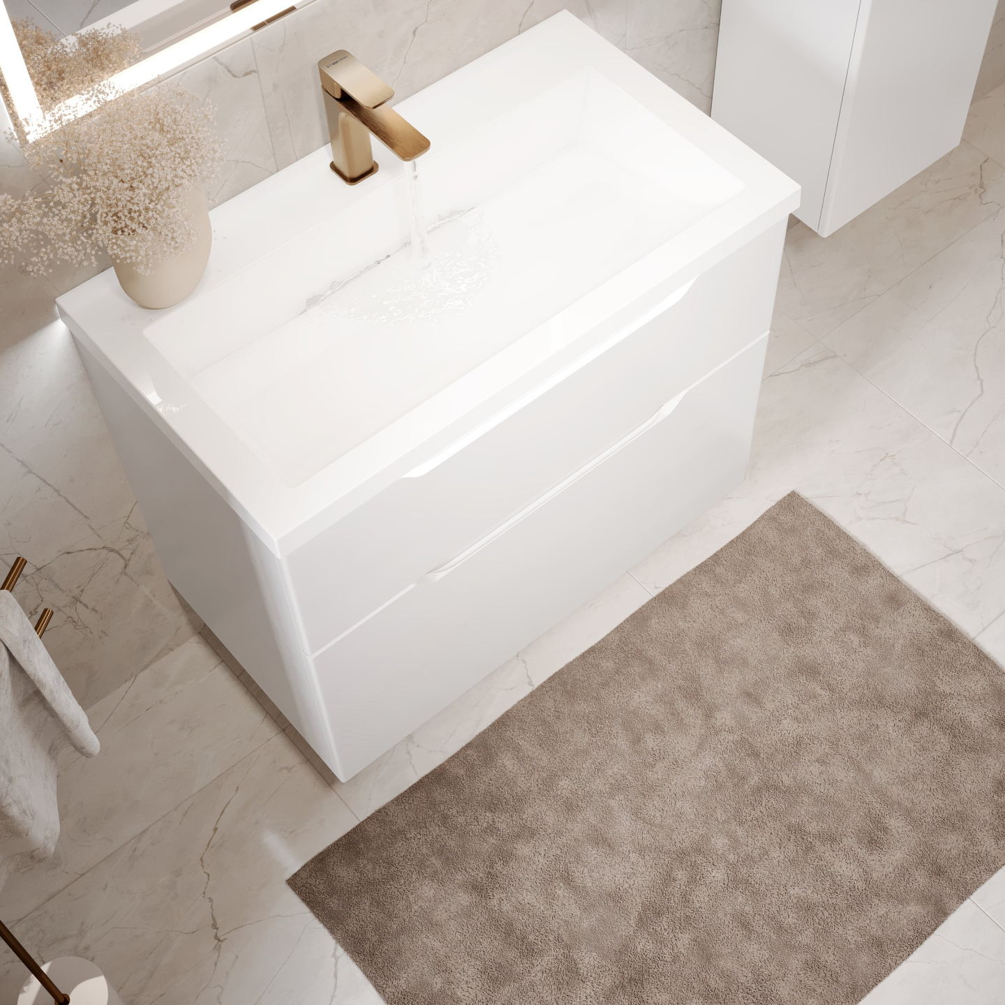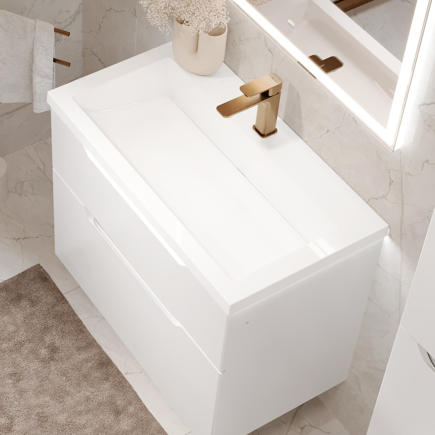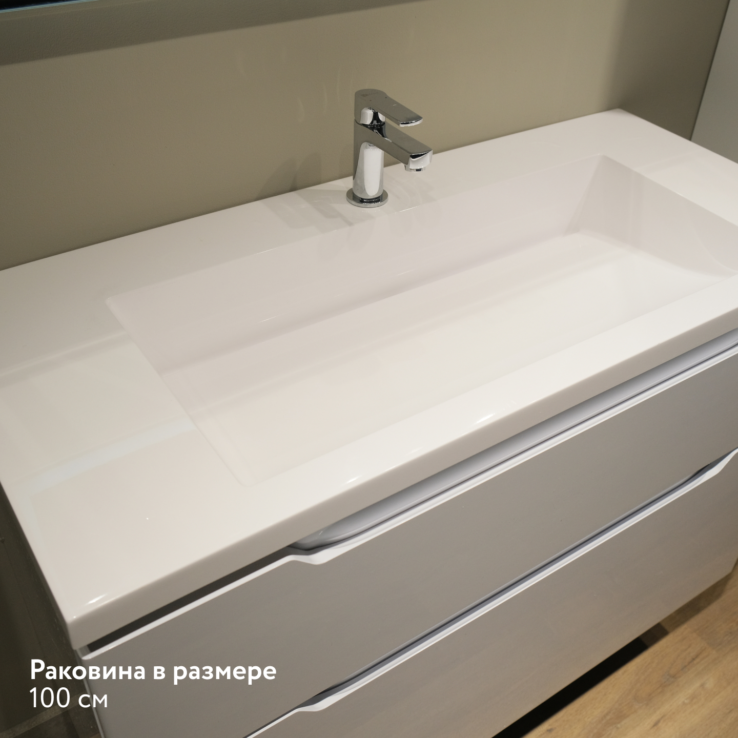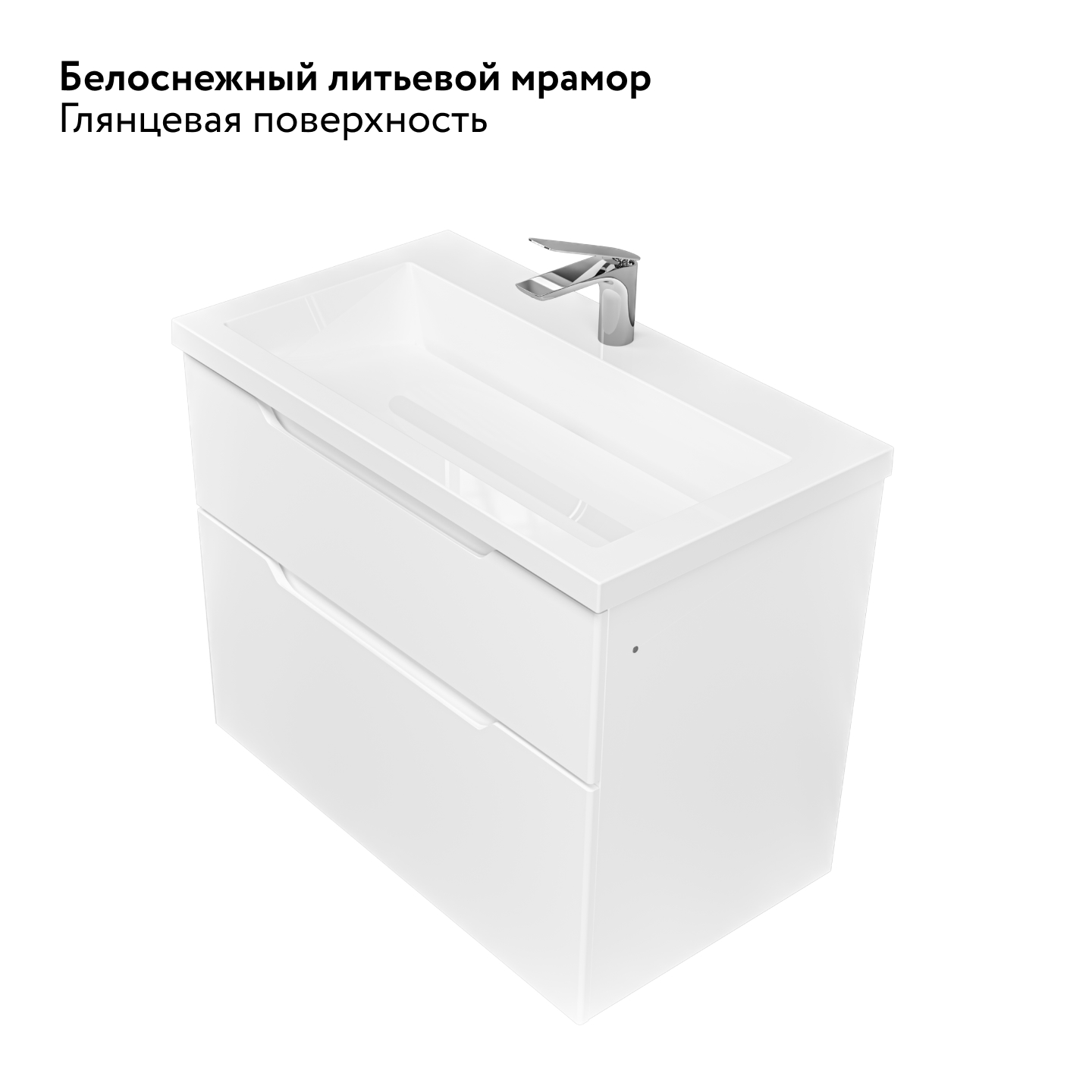 Идеально белая раковина из литьевого мрамора с щелевым сливом поддерживает...образ чистоты и универсальной лаконичности дизайна.