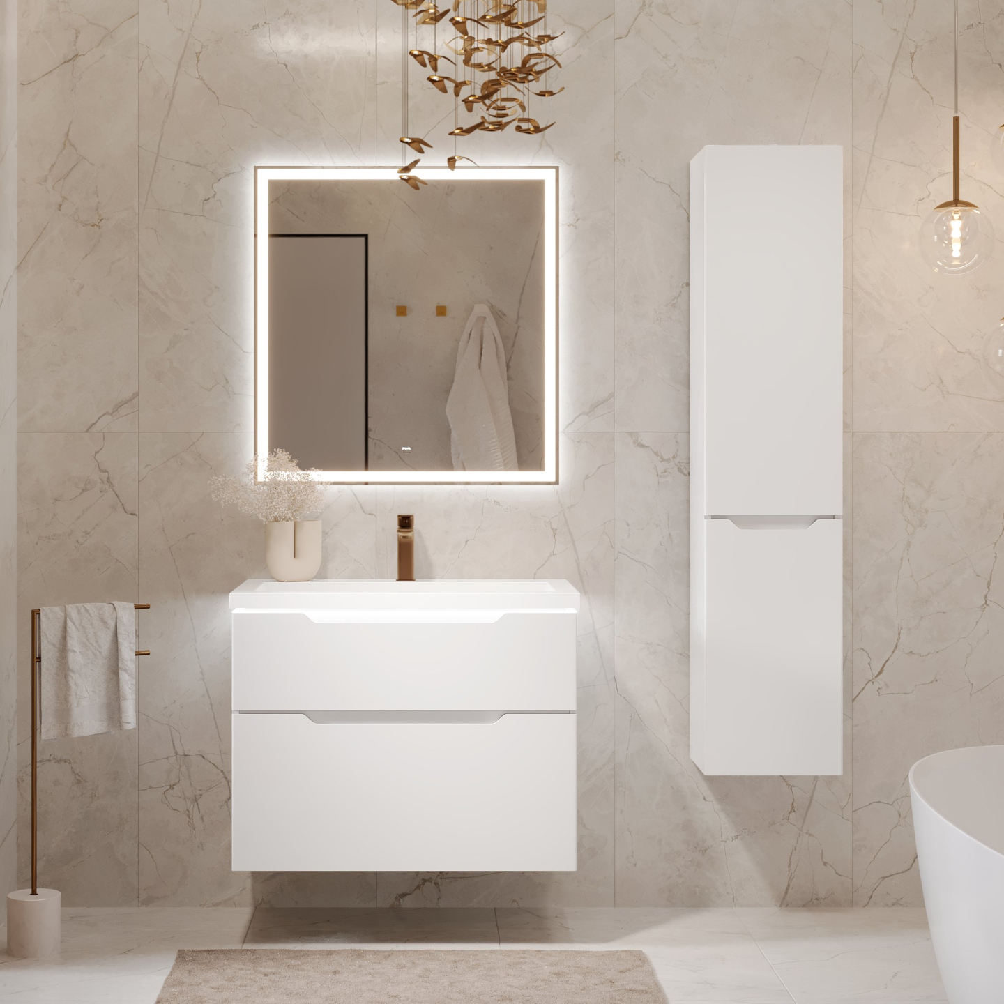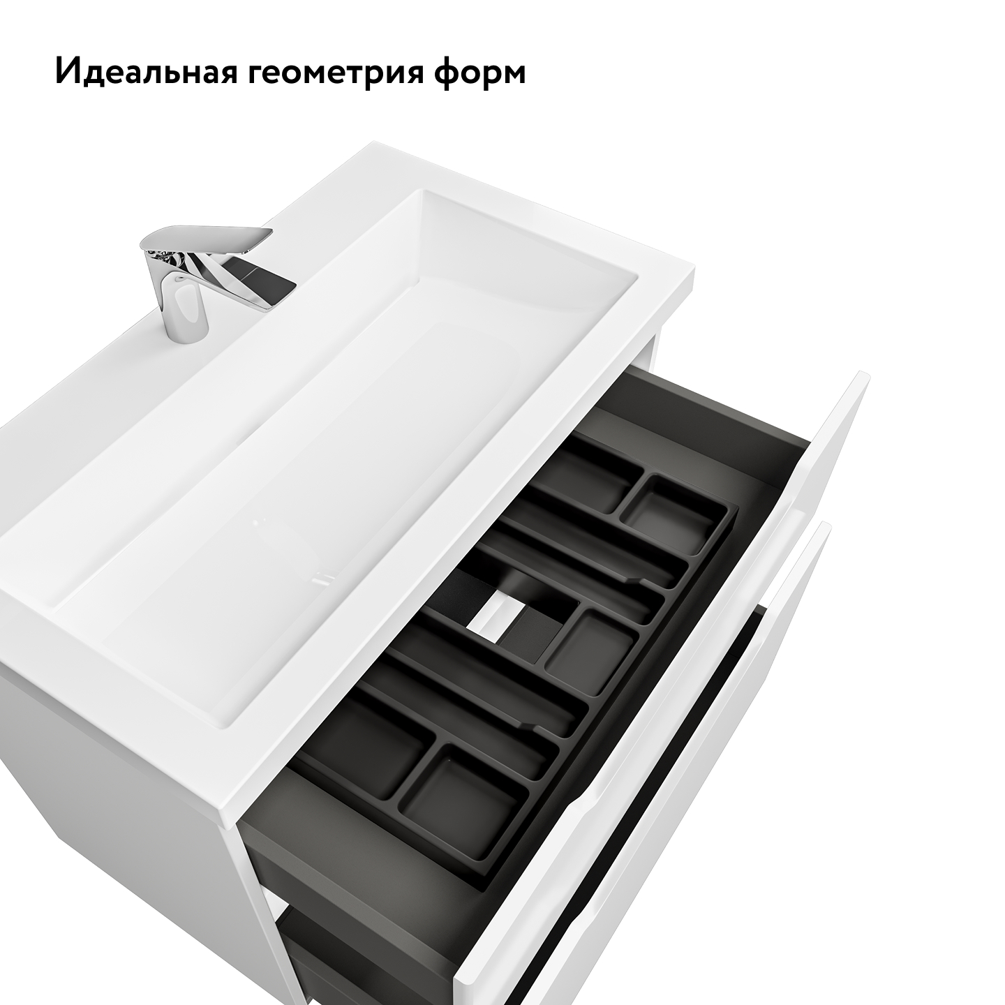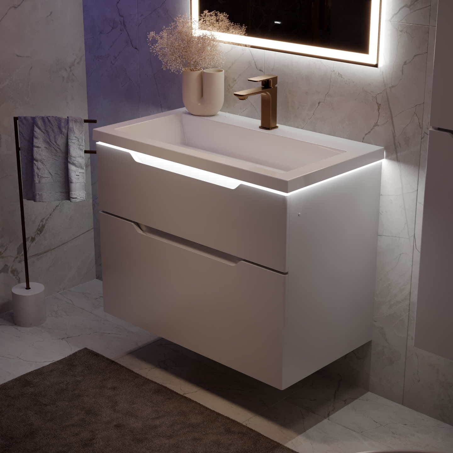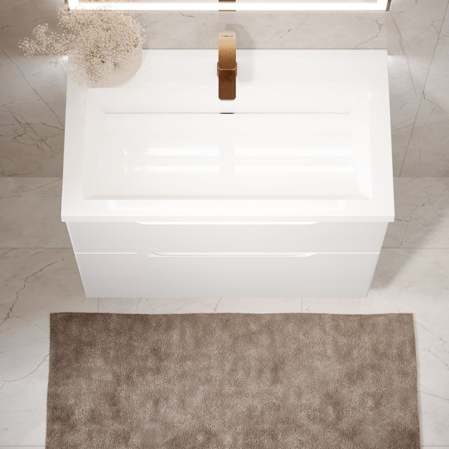 Идеально белая раковина из литьевого мрамора с щелевым сливом поддерживает...образ чистоты и универсальной лаконичности дизайна.