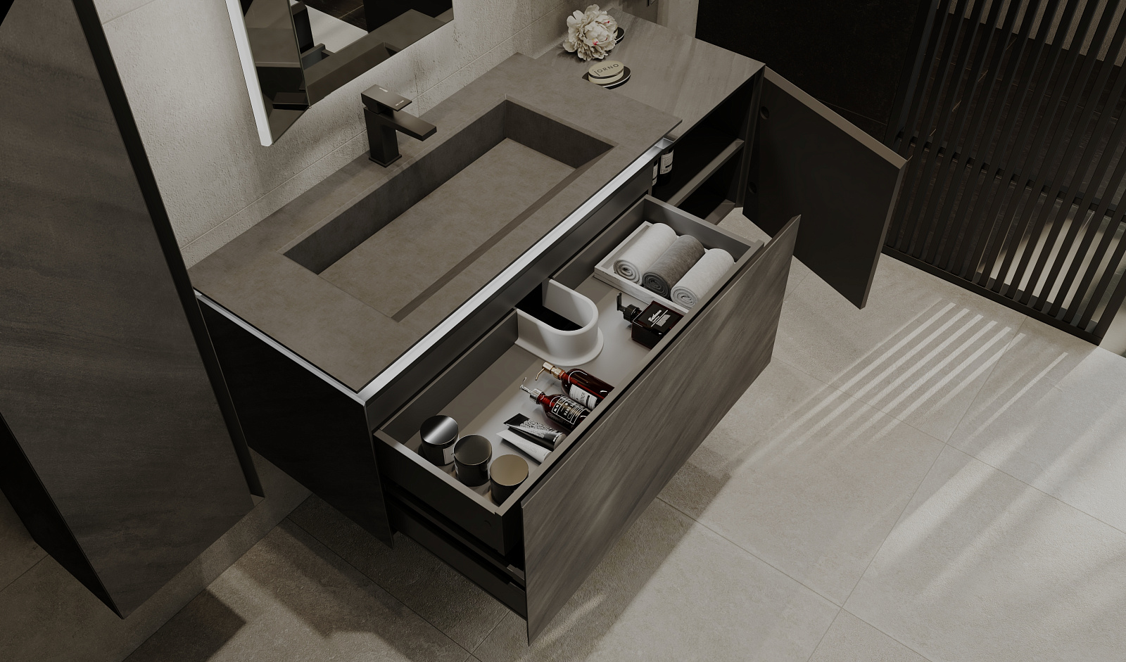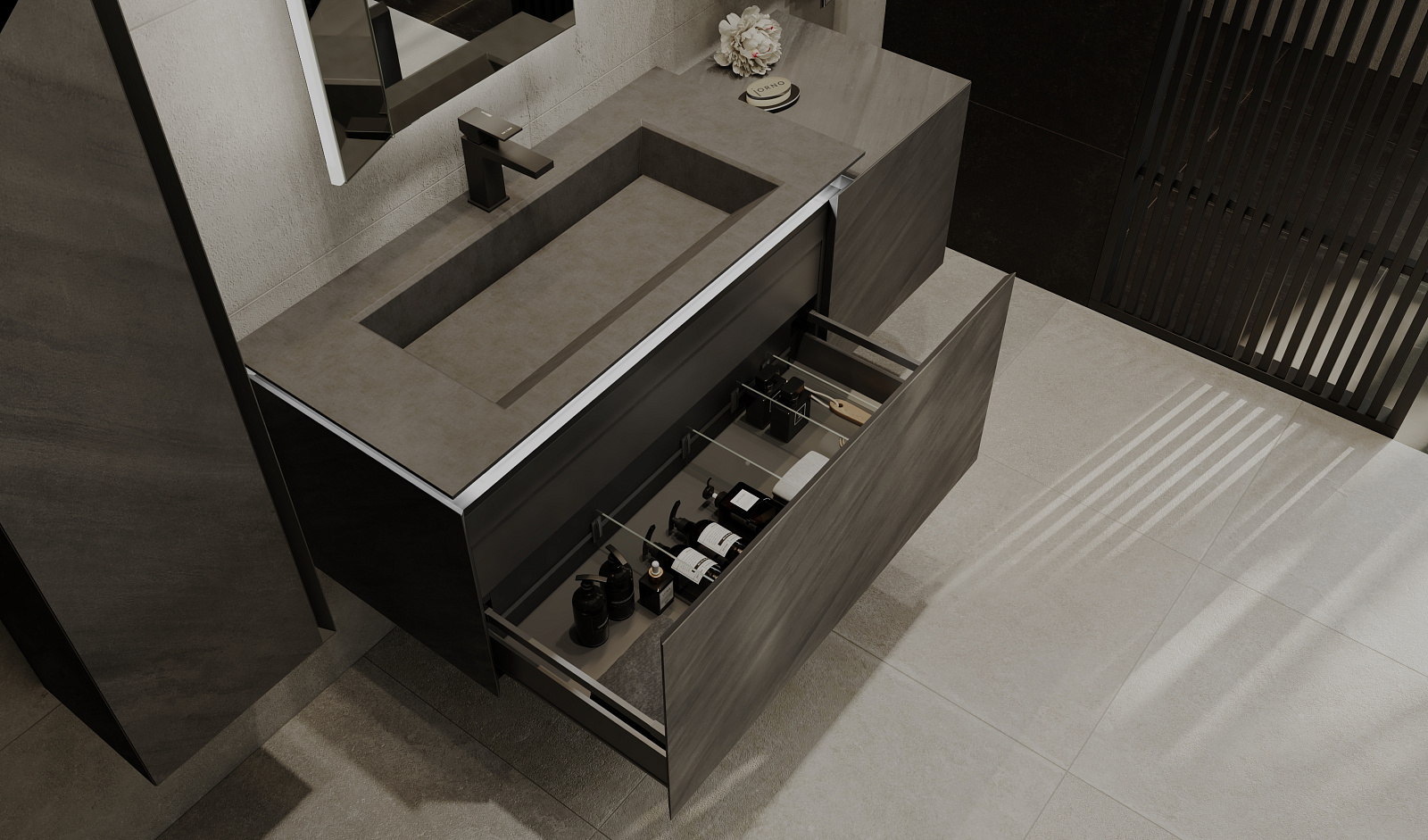 Тумба оснащена подсветкой раковины со скрытым сенсорным включением, Раковина из архитектурного бетона с диммерным выключателем, которая создает эффект парения. Контраст между тяжестью бетона раковины на тумбе и легкостью света под ним придает особую эмоциональность, власть духа над материей.