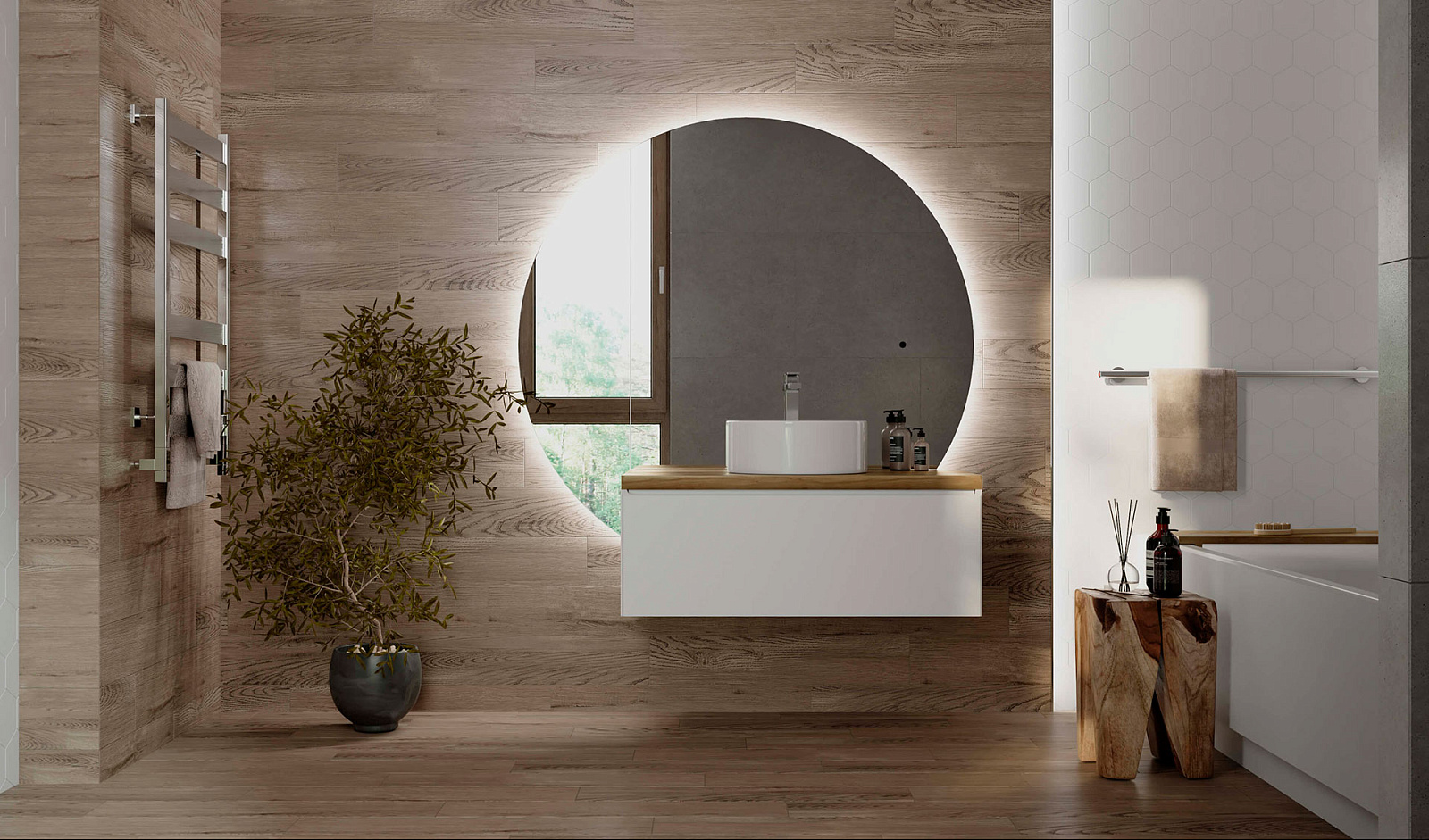 Вариативность комплектации зеркала позволяет адаптировать коллекцию по ширине, функционалу и визуальному богатству образа. Большое круглое зеркало с подсветкой по периметру, напоминающее солнечный диск, увеличивает пространство ванной комнаты, смягчает его и придает гармонию интерьеру ванной комнаты. Светодиодная подсветка зеркала оснащена бесконтактным выключателем. Пенал, встроенный в зеркало, имеет дополнительную вертикальную подсветку.