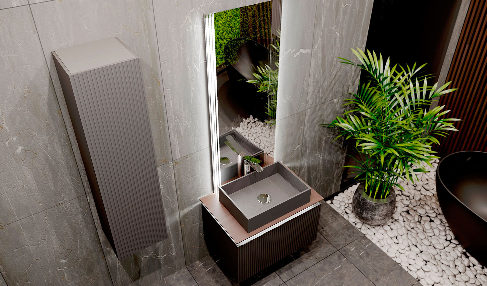 Столешница из цельного массива бука, которому придали темный оттенок и влагостойкость, оснащена подсветкой. Внутри тумбы есть скрытый ящик для хранения мелочей. ВАЖНО! При выборе смесителя просьба обратить внимание на схему столешницы. Мы рекомендуем устанавливать сенсорный смеситель или смеситель с боковым открыванием.