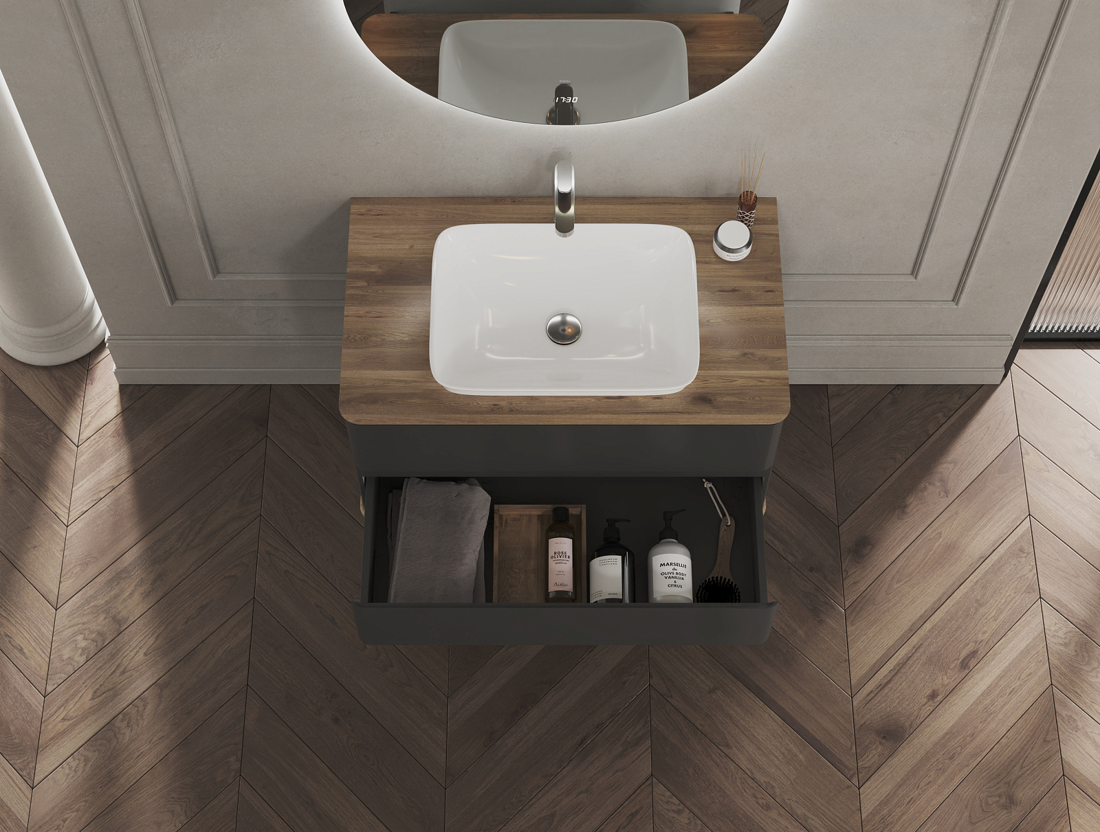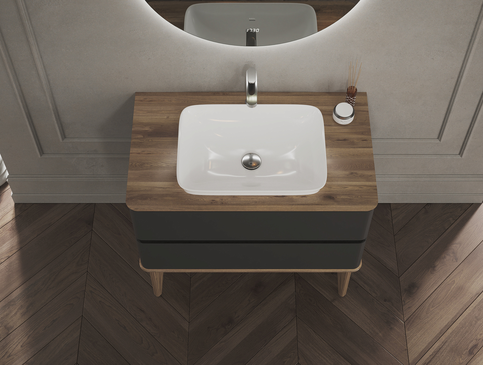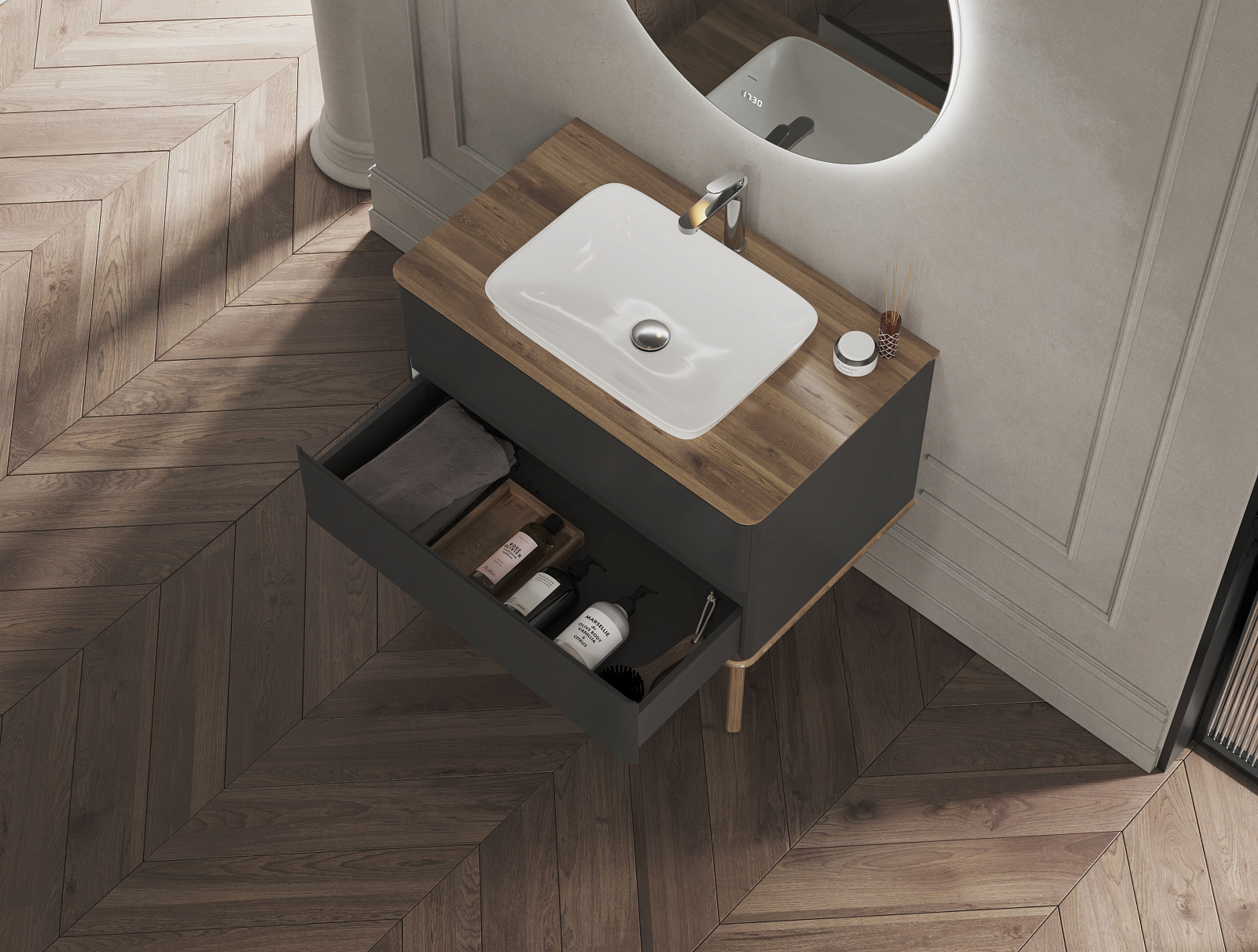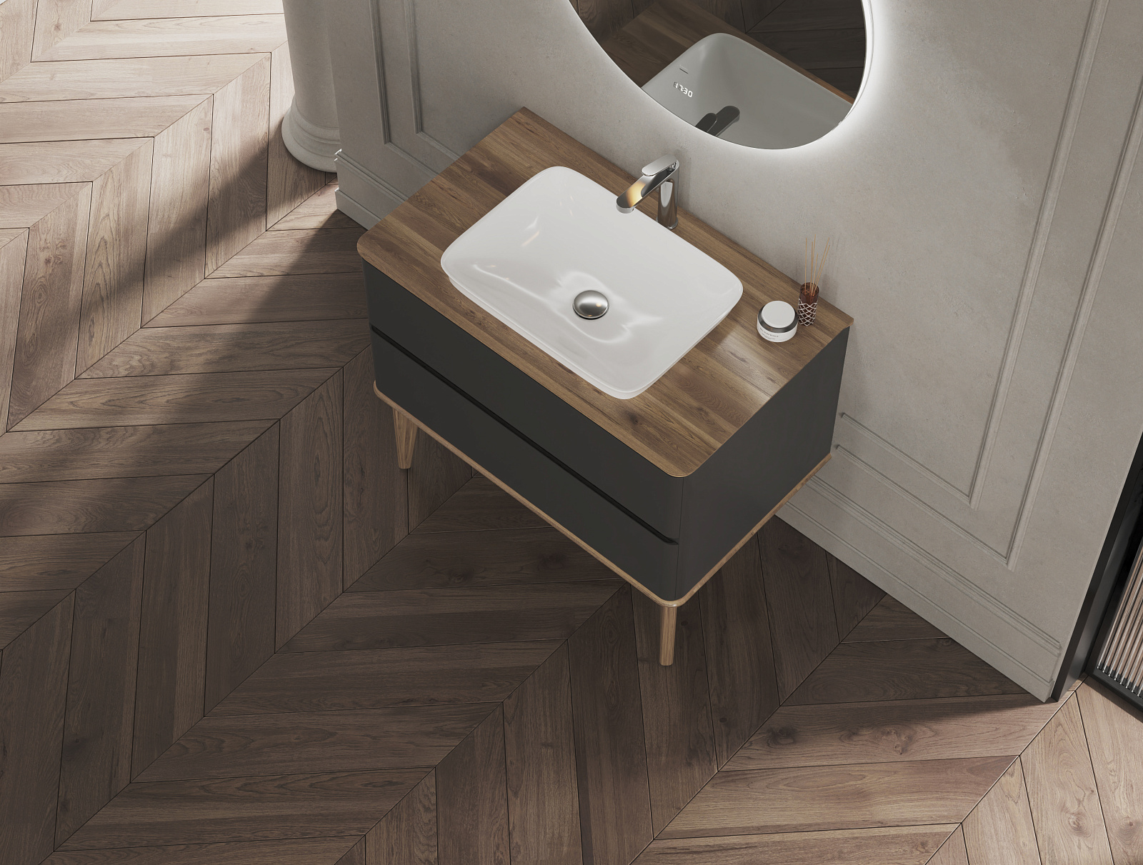 - Soft-touch поверхность. Корпус и фасад тумбы из МДФ в матовой пленке ПВХ