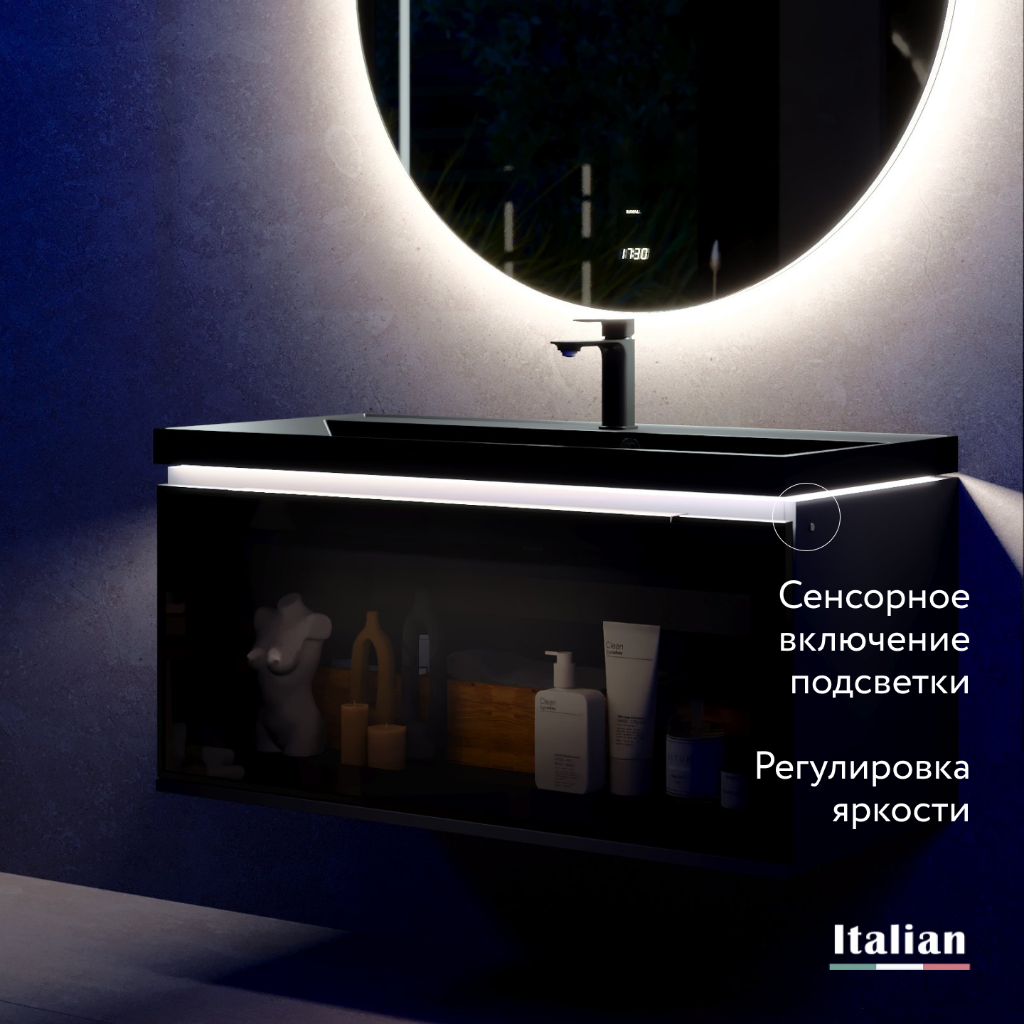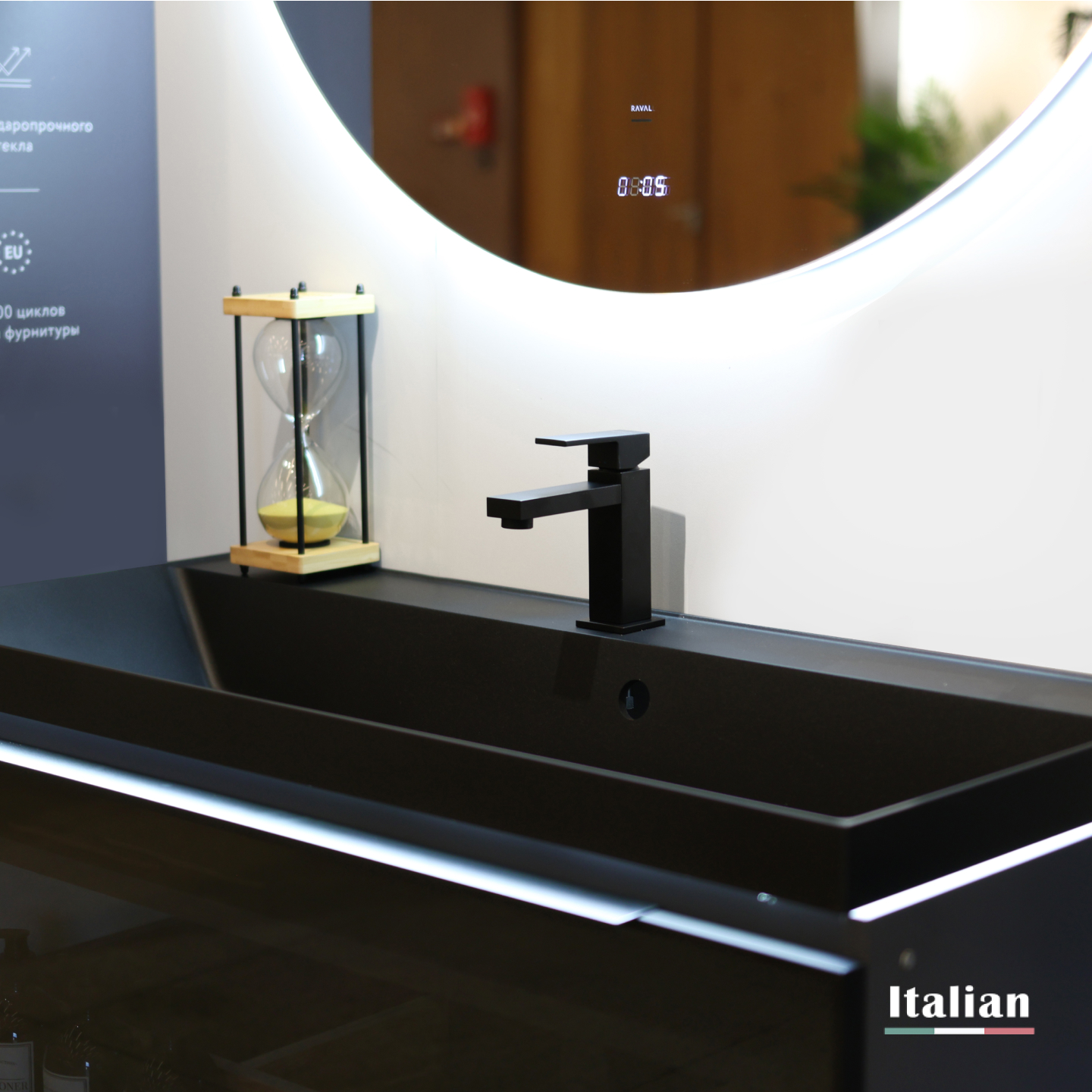 Чёрная вкладная раковина с подсветкой по периметру прекрасно вписываются в общую концепцию гармонии противоречий – силы и легкости.