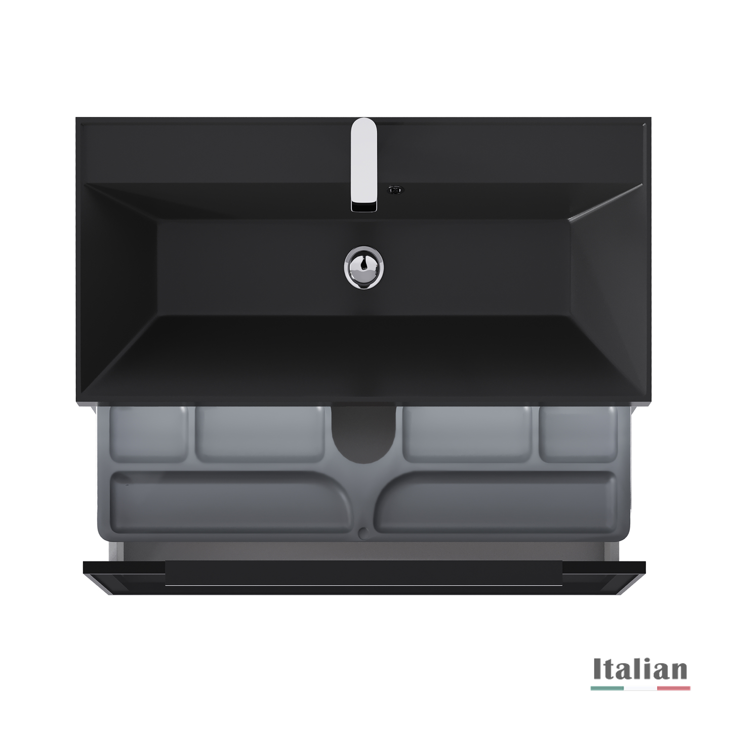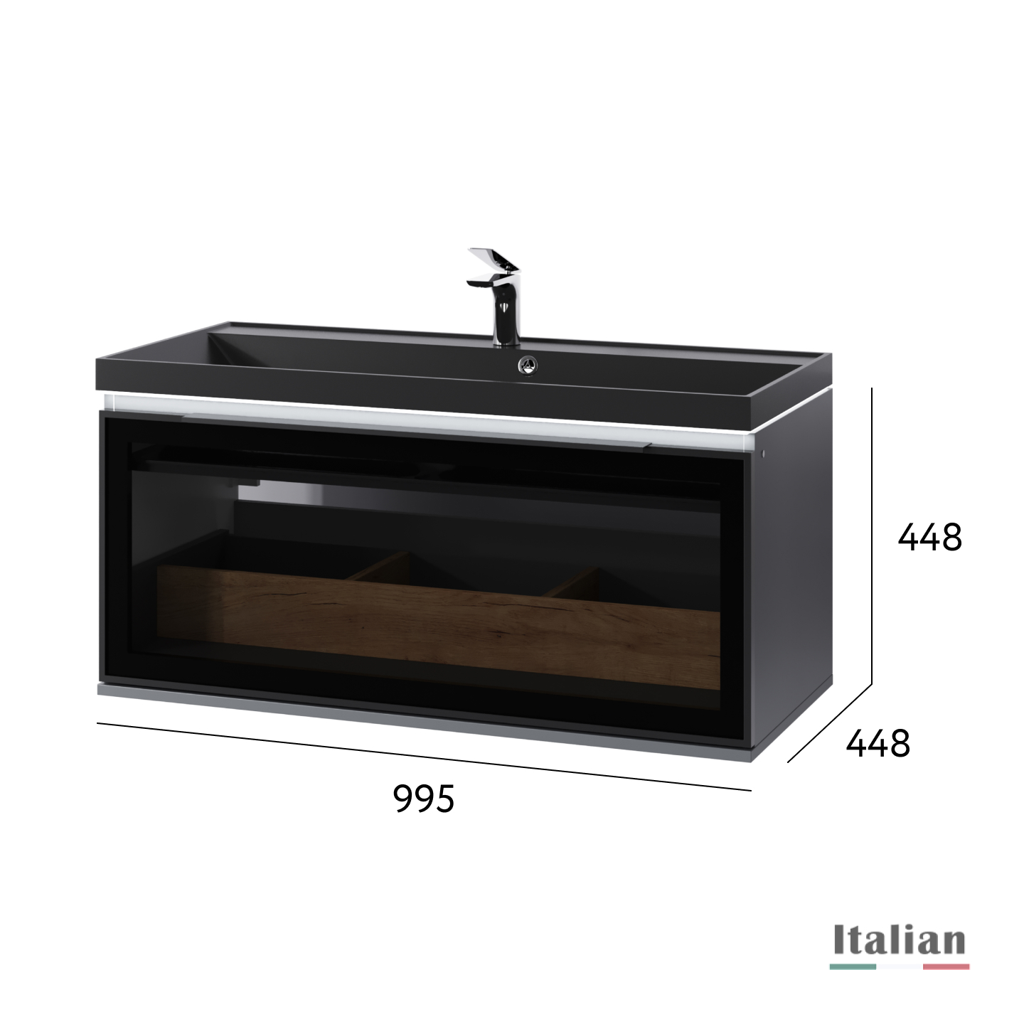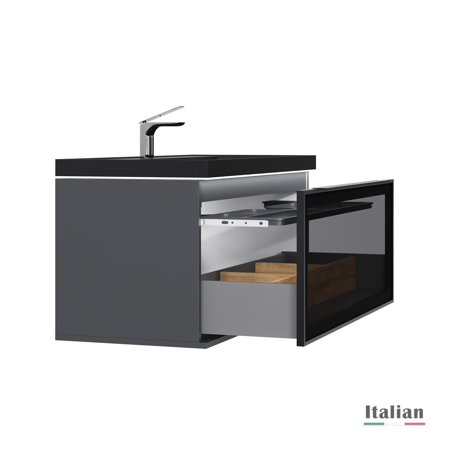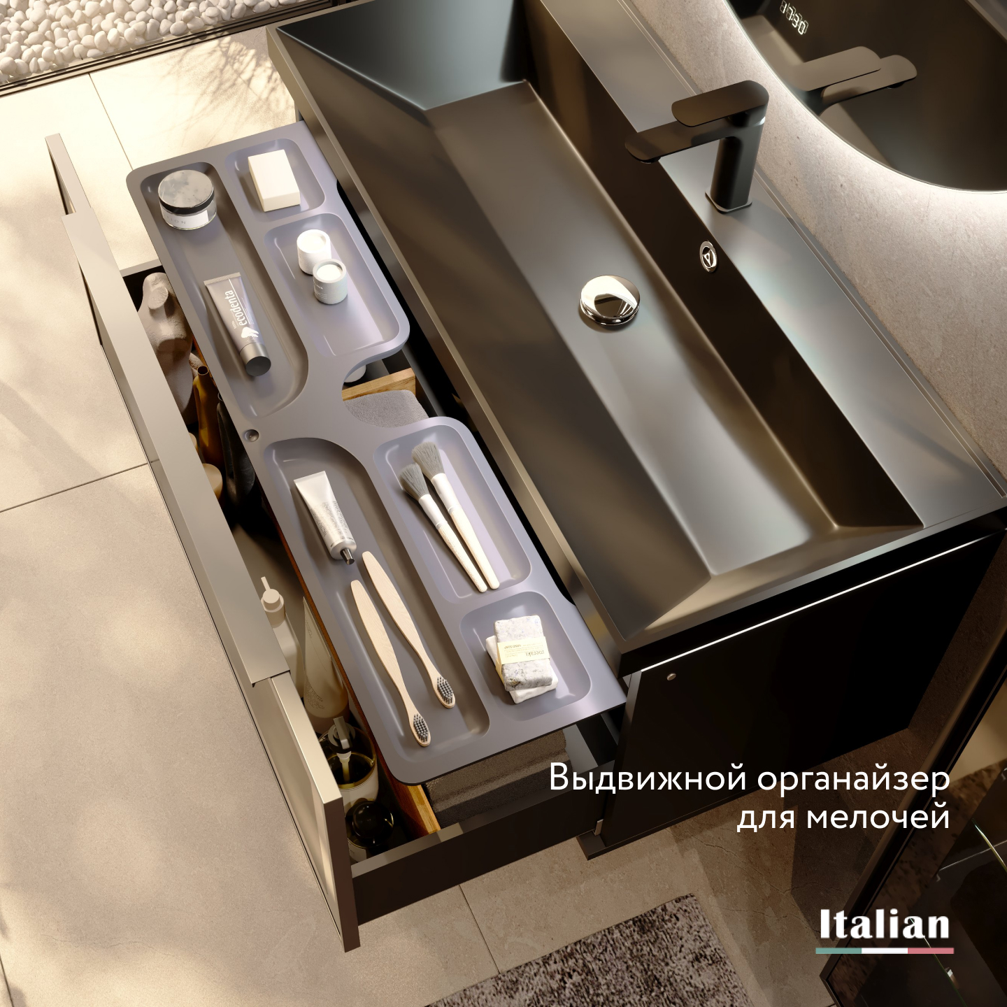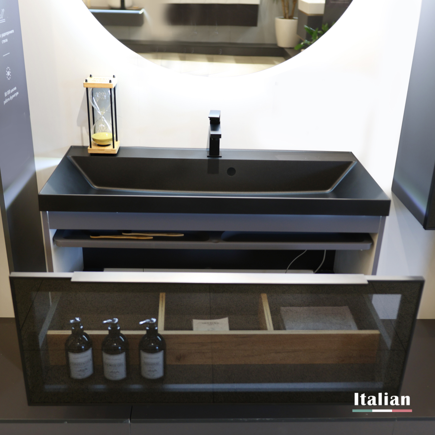 Трендовое сочетание цветов натурального дерева и антрацит внутри ящиков тумбы подчеркивают изысканность комплекта.