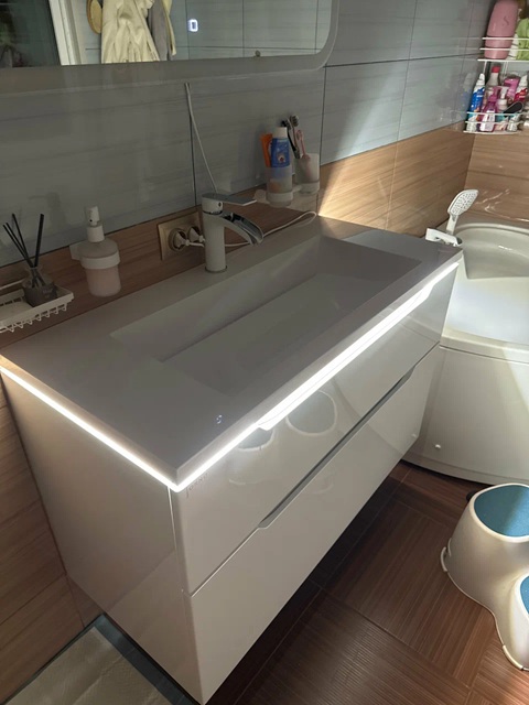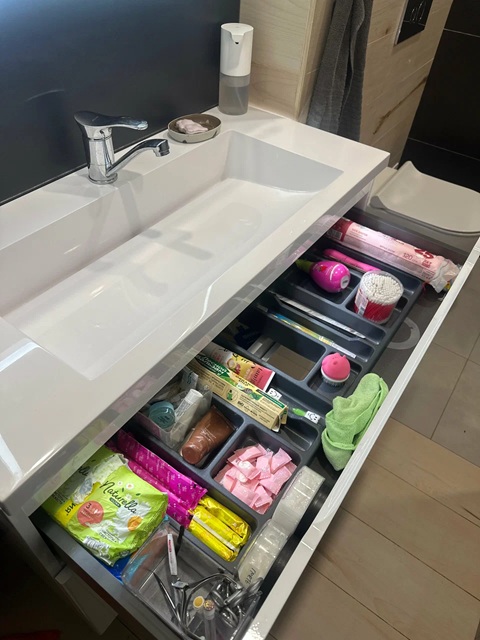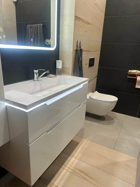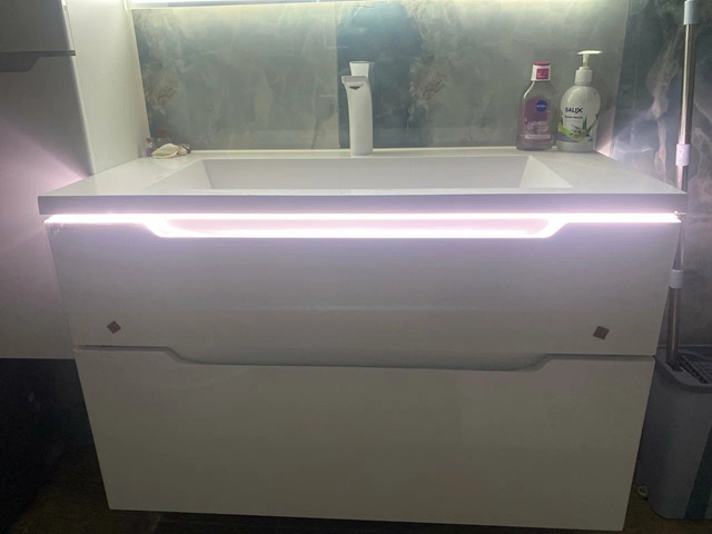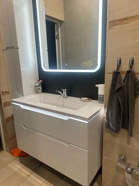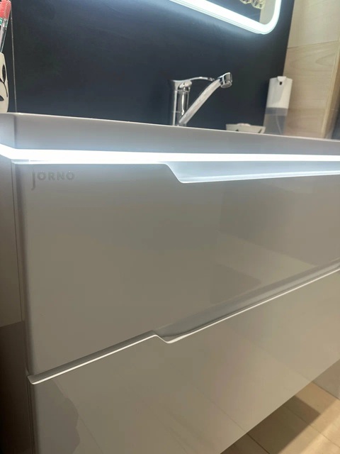 Встроенный органайзер для мелочей позволяет удобно разместить все необходимое, сохраняя порядок. Подсветка по периметру тумбы создаёт эффект парящей раковины, который придаёт интерьеру лёгкость и воздушность.