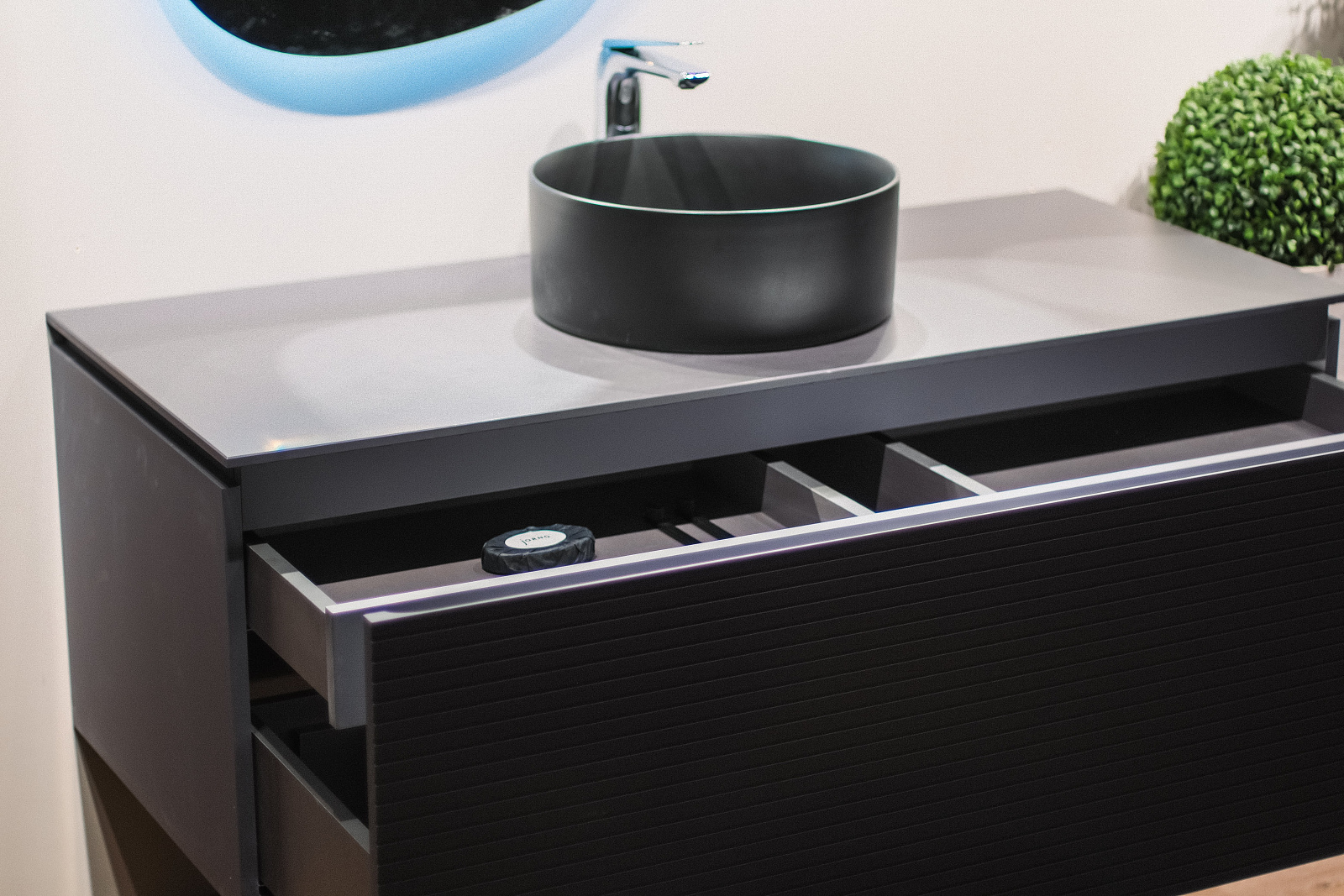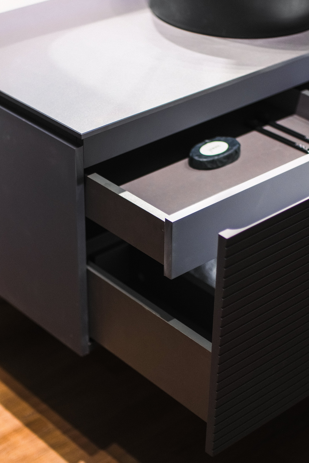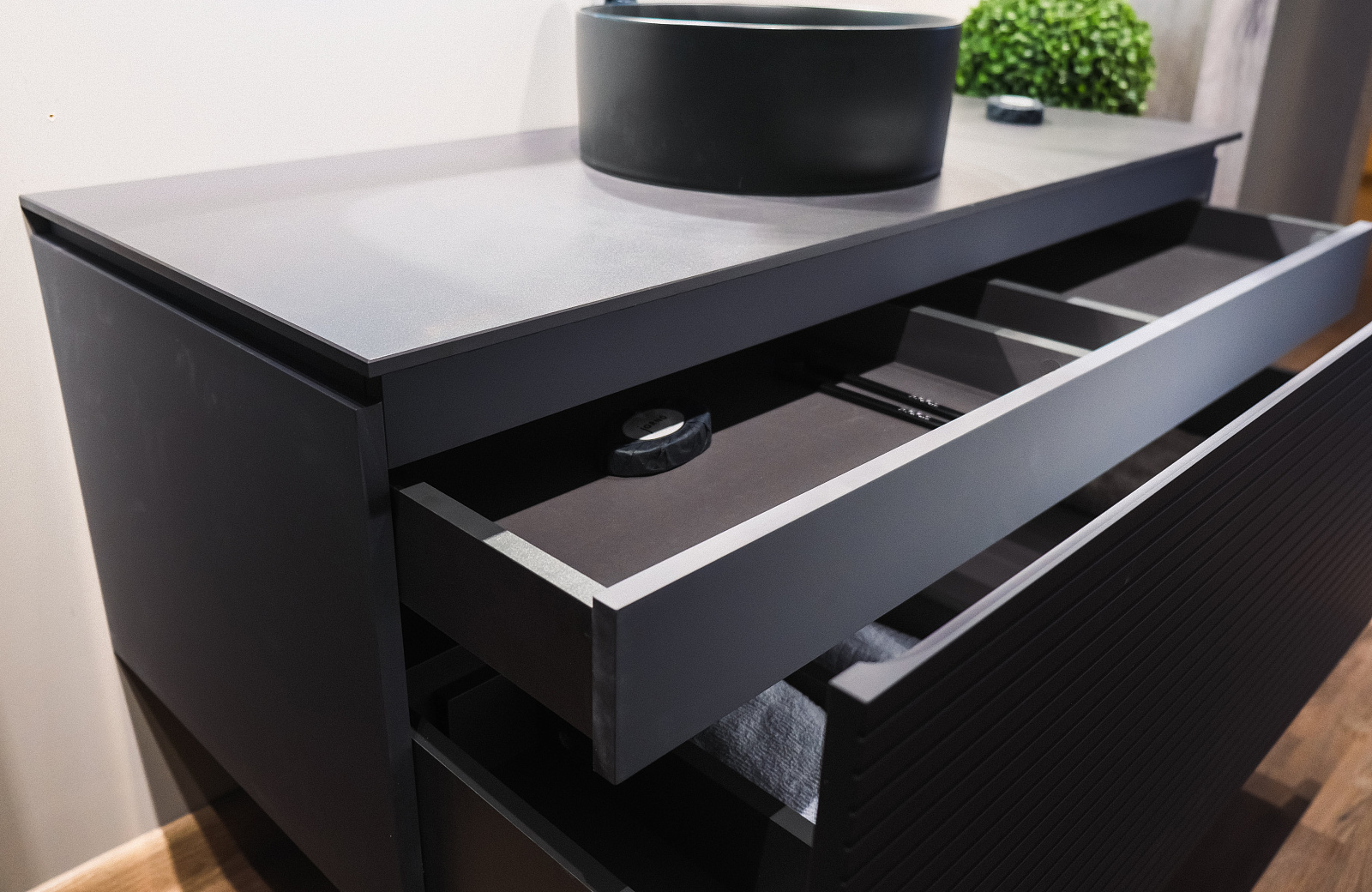 Доводчик большого ящика притормаживает немного, как будто то ли тяжелый ящик, то ли уклон нужен. Отверстия в столешнице идут только заводские, нельзя заказать под себя. Не понятно было, как извлечь для монтажа маленький ящик, но менеджер дала совет.