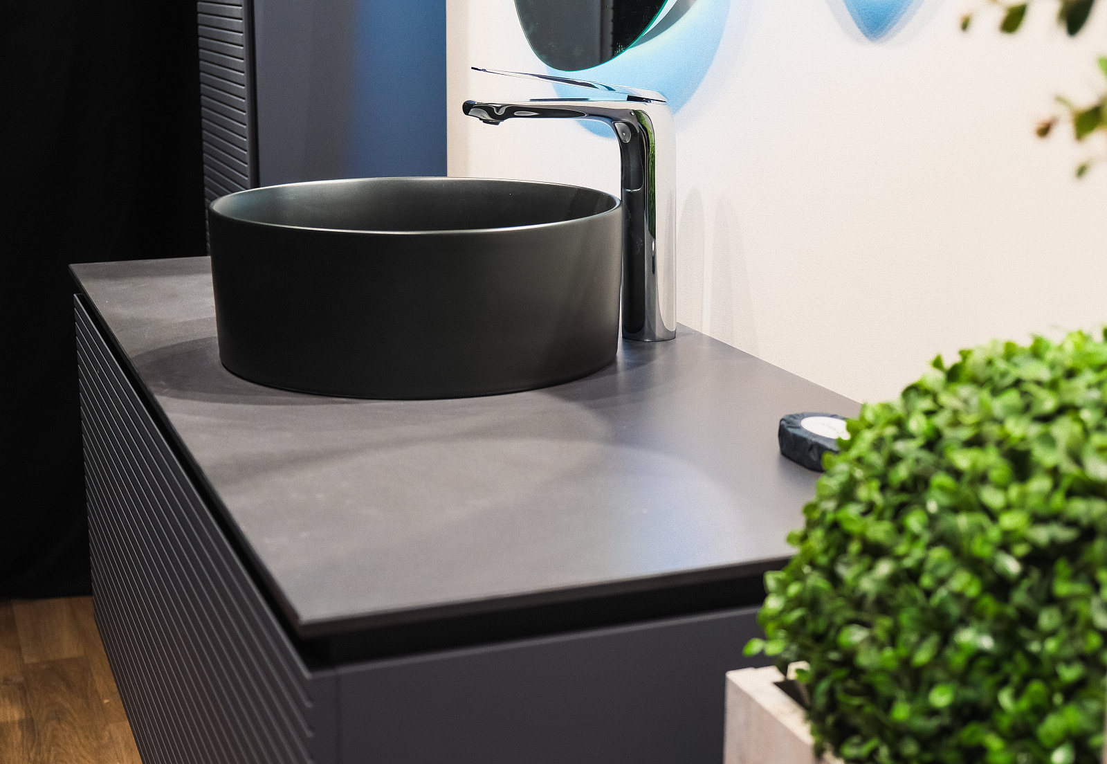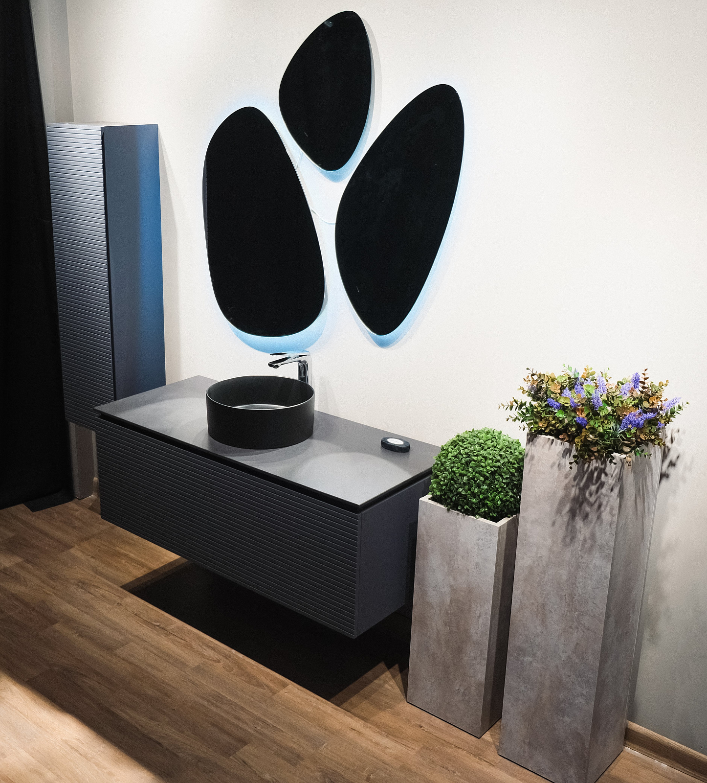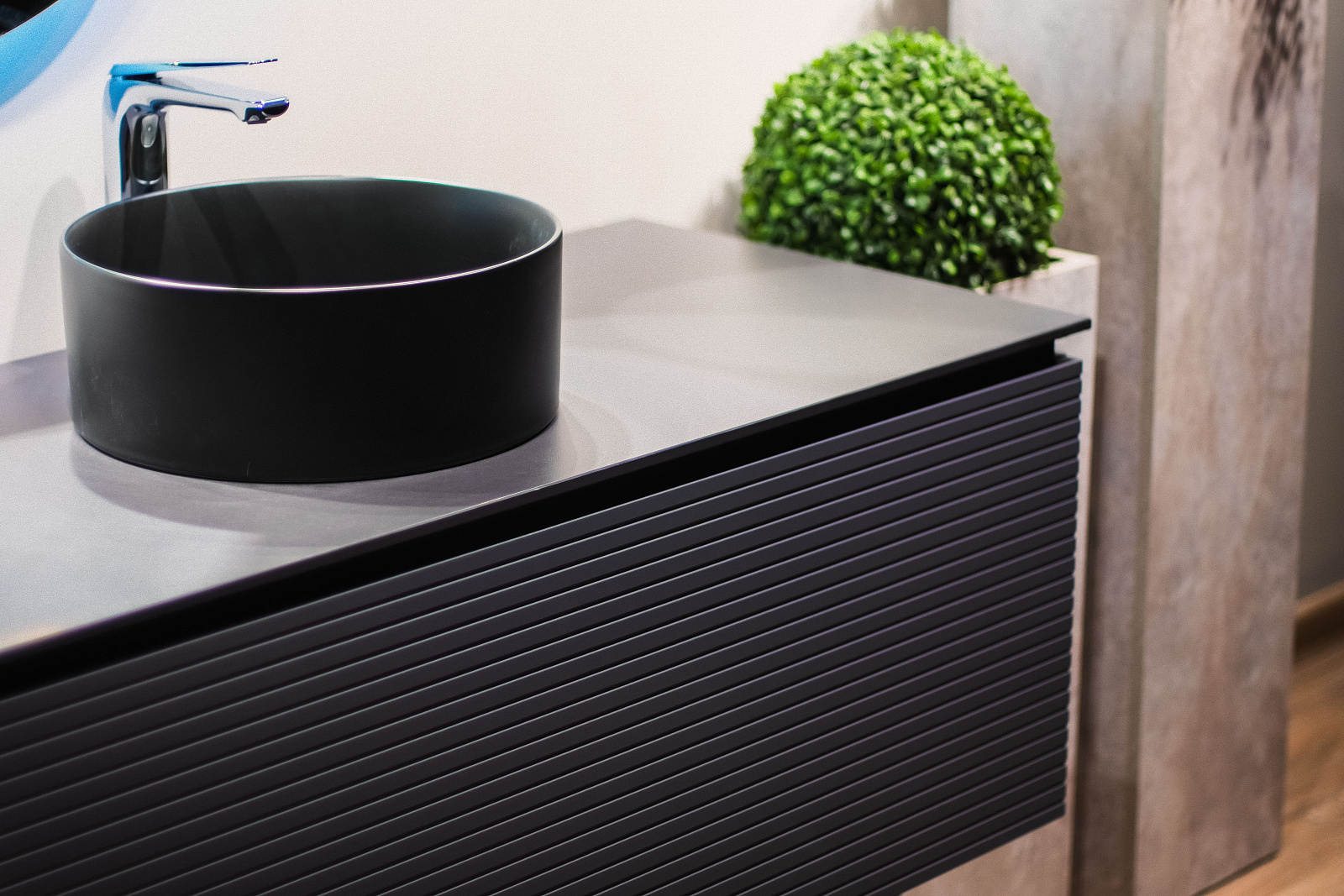 Эффектная и геометричная тумба выполнена из влагостойких материалов.