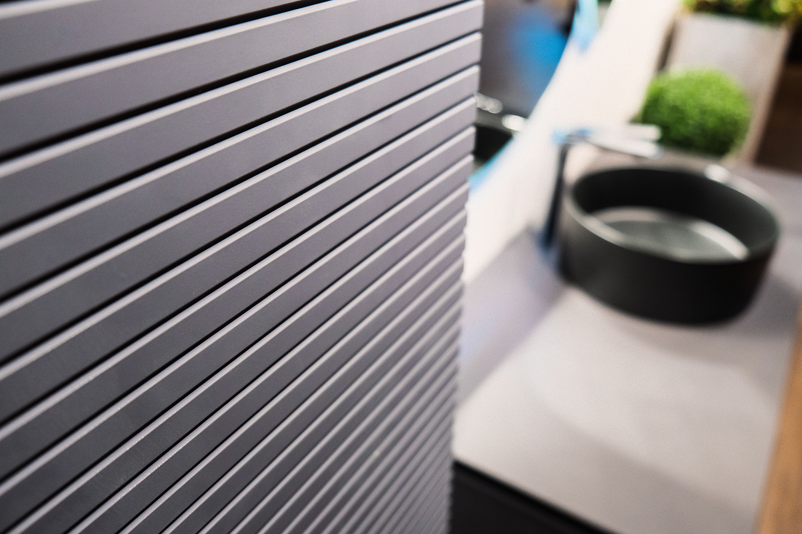 Столешница из керамогранита в сочетании с горизонтальной фрезеровкой фасадов, передает стиль жизни городского человека.